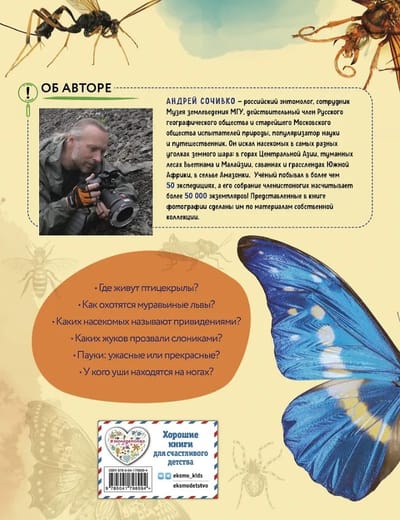 Автор книги, учёный-энтомолог Андрей Сочивко, побывал в разных уголках земного шара и собрал тысячи любопытных фактов о всех видах насекомых, включая самые редкие и экзотические. В них поразительно всё — от строения и внешнего вида до поведения и взаимодействия с человеком. Одни обладают пугающей или обманчиво прекрасной внешностью, другие — уникальными способностями, которыми не могут похвастаться никакие другие животные. А уникальные яркие фотографии, созданные автором, позволят разглядеть крылатых, многоногих и жужжащих во всей красе.