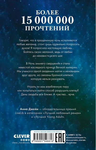Говорят, что в праздничную ночь исполняются любые желания, стоит лишь правильно попросить духов! Я попросила настоящую любовь… Бойтесь своих желаний, ведь от любви до ненависти всего один шаг. В Ночь зимнего свершения я стала невестой наследного принца Вечной империи. Мы учимся в одной академии магии и ненавидим друг друга, но связаны брачной клятвой, которую нельзя разорвать. Играть ли нам влюбленную пару или попытаться найти способ разрушить клятву? День свадьбы все ближе. А чувства… ярче.