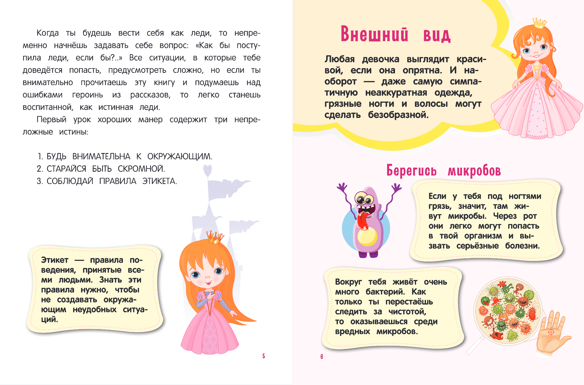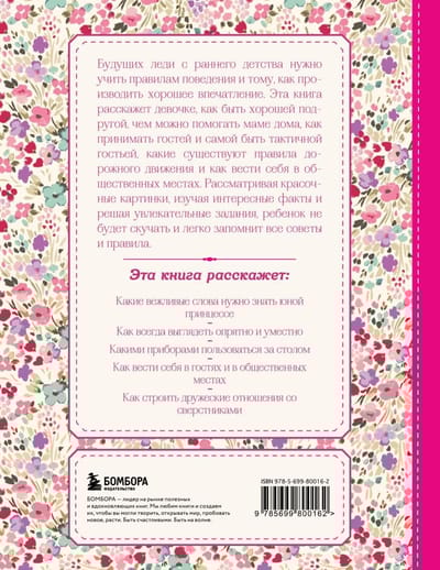 Будущих леди с раннего детства нужно учить правилам поведения и тому, как производить хорошее впечатление. Эта книга расскажет девочке, как быть хорошей подругой, чем можно помогать маме дома, как принимать гостей и самой быть тактичной гостьей, какие существуют правила дорожного движения и как вести себя в общественных местах. Рассматривая красочные картинки, изучая интересные факты и решая увлекательные задания, ребенок не будет скучать и легко запомнит все советы и правила.