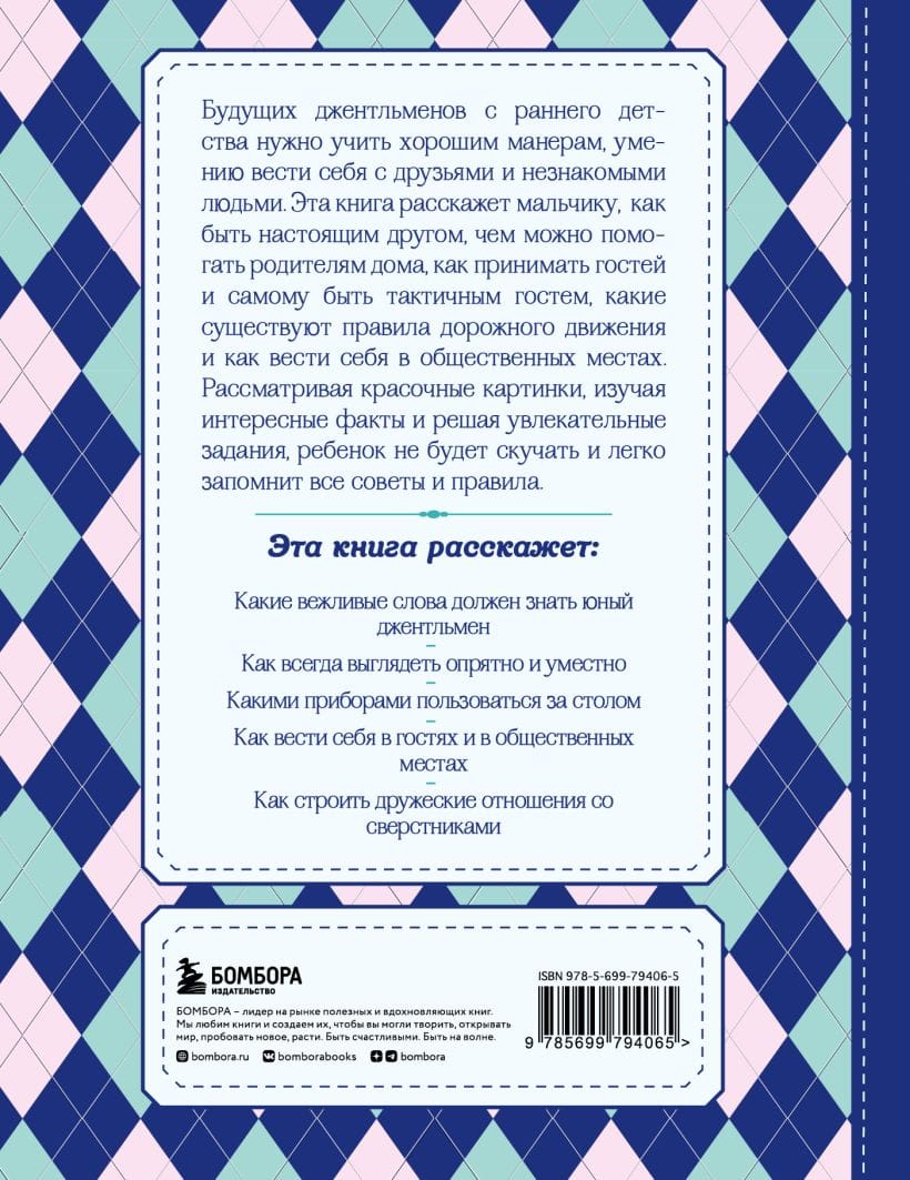 Будущих джентльменов с раннего детства нужно учить хорошим манерам, умению вести себя с друзьями и незнакомыми людьми. Эта книга расскажет мальчику как быть настоящим другом, чем можно помогать родителям дома, как принимать гостей и самому быть тактичным гостем, какие существуют правила дорожного движения и как вести себя в общественных местах. Рассматривая красочные картинки, изучая интересные факты и решая увлекательные задания, ребенок не будет скучать и легко запомнит все советы и правила.