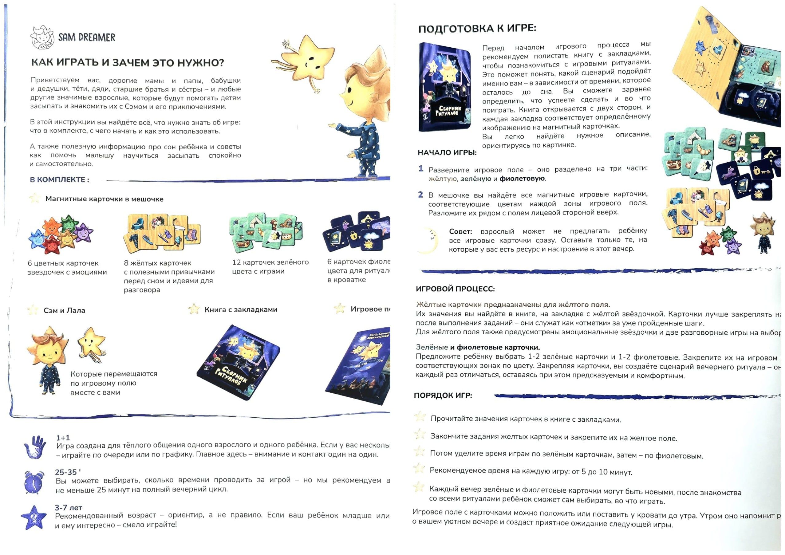 - Инструкция — полезная информация для родителей, подробное описание правил игры, полезные советы и подсказки для налаживания сна.