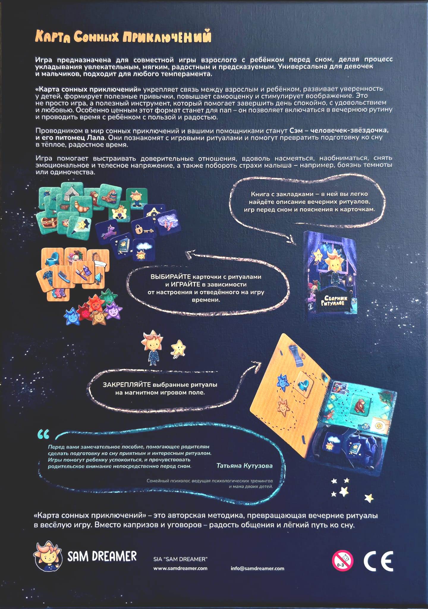 В основе игры — принципы детской психологии и потребности семьи, которая живет в быстром современном ритме. Особенно ценной игра станет для пап, которые хотят наладить собственное время с малышом. Игра дает основу общения, понятные задания и милые шалости, которые не надо продумывать самому, а только следовать волшебной дорогой сна.