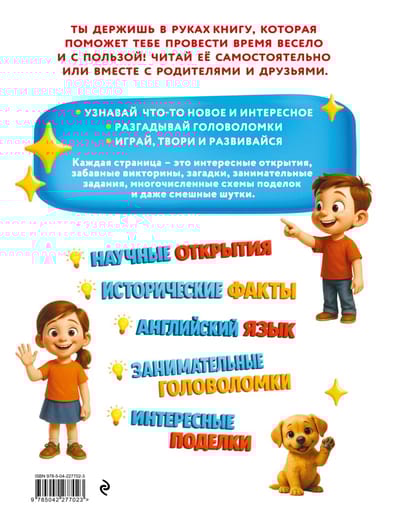 Подарок для вашего ребенка к любому празднику! Большая книга головоломок и поделок с яркими картинками и увлекательными заданиями подойдет мальчикам и девочкам 6, 7, 8, 9 лет. С ее помощью легко развить внимание и память, логическое мышление и интеллект, речь и воображение, и даже чувство юмора. А еще — начать изучать английский язык и освоить несложные приемы релакса от психологов. Роскошное подарочное издание украсит домашнюю библиотеку и станет прекрасным подарком на день рождения, 1 сентября, 8 марта, 23 февраля, Новый год, выпускной в детском саду, да и просто без повода. Внутри — ребусы, шарады, головоломки, забавные анекдоты, интересные исторические факты и викторины. Ребенок с удовольствием будет заниматься по книжке и самостоятельно, и с друзьями, одновременно формируя позитивное отношение к учебе и расширяя кругозор. Эта книга — отличный способ организовать полезный досуг детей.