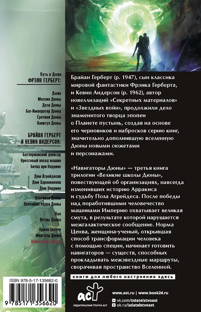 «Навигаторы Дюны» – третья книга трилогии «Великие школы Дюны», повествующей об организациях, навсегда изменивших историю Арракиса и судьбу Пола Атрейдеса.