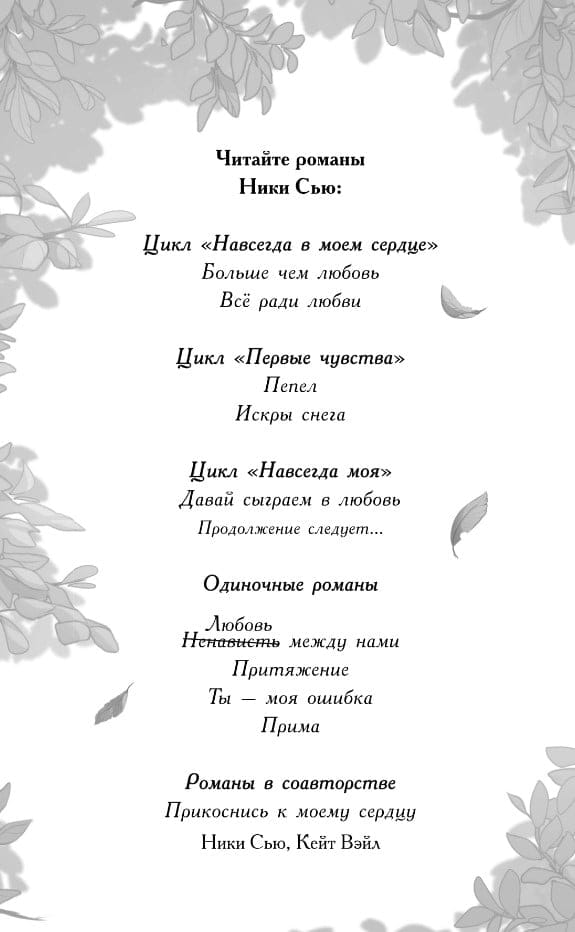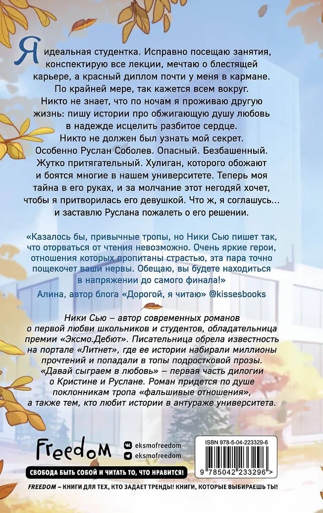 «Давай сыграем в любовь» — первая часть дилогии о Кристине и Руслане. Роман придется по душе поклонникам тропа «фальшивые отношения», а также тем, кто любит истории в антураже университета. История была тепло принята на портале «Литнет», где уже набрала более 1,2 млн прочтений!