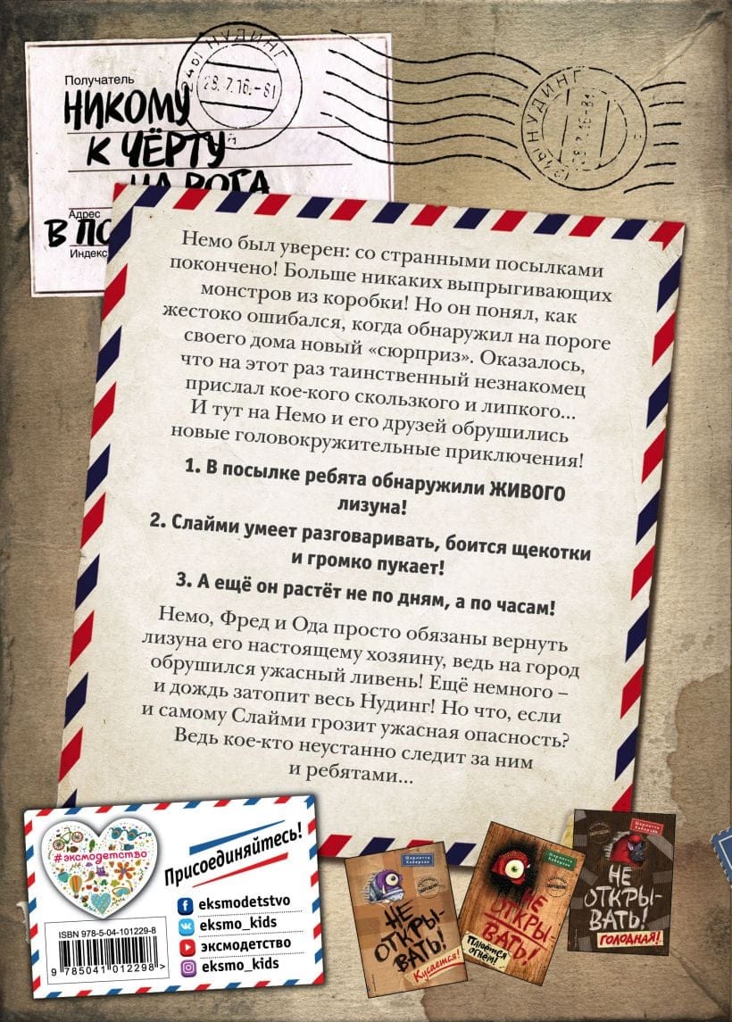 После приключений с плюшевым Айси Немо мог бы понять: ни в коем случае нельзя открывать посылки от незнакомцев! Однако когда мальчик нашёл на пороге своего дома новую коробку, он решил, что её нужно обязательно открыть. Снова! На этот раз в посылке оказался липкий, зелёный и скользкий… ЛИЗУН! Слайми умеет разговаривать, боится щекотки и иногда громко пукает. Стоило ему выбраться из коробки, как над городом пошел ужасный ливень! Теперь Немо и его друзьям Фреду и Оде нужно срочно найти настоящего хозяина Слайми. А тем временем кое-кто уже начал следить за лизуном и ребятами… Берегись, Слайми!