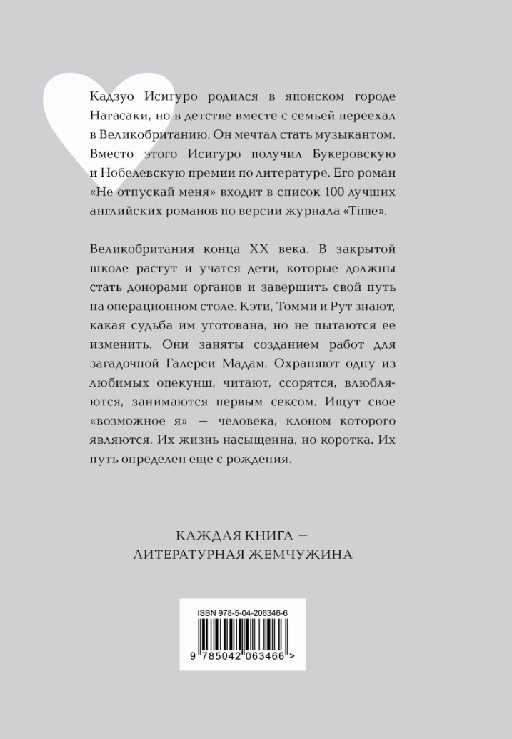 Кадзуо Исигуро родился в японском городе Нагасаки, но в детстве вместе с семьей переехал в Великобританию. Он мечтал стать музыкантом. Вместо этого Исигуро получил Букеровскую и Нобелевскую премии по литературе. Критики его часто сравнивали с Владимиром Набоковым — оба автора стали классиками и при этом писали свои шедевры на неродном языке. «Не отпускай меня» входит в список 100 лучших английских романов по версии журнала «Time».