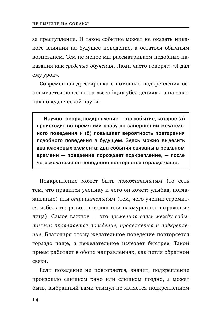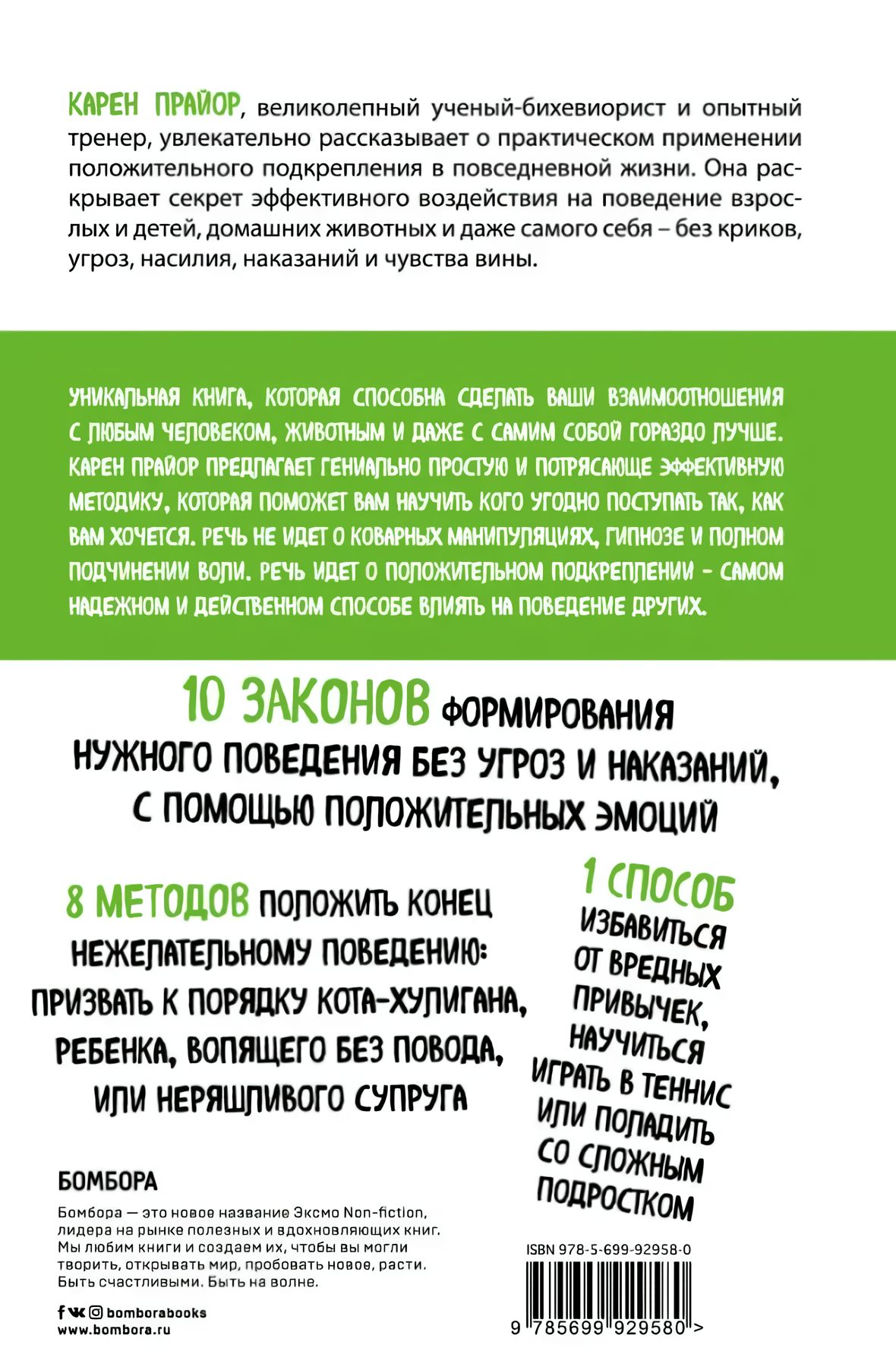 Карен Прайор предлагает гениально простую и эффективную методику, которая поможет вам научить кого угодно поступать так, как вам хочется. Речь не идет о коварных манипуляциях, гипнозе и полном подчинении воли. Речь идет о положительном подкреплении — самом надежном и действенном способе влиять на поведение других. Вы узнаете, как заставить супруга раз и навсегда перестать ворчать; как научить трехлетнего ребенка вести себя прилично; как объяснить кошке, что не надо залезать на кухонный стол; как сподвигнуть начальника регулярно повышать вам зарплату; как улучшить свои собственные результаты в любой деятельности — от занятий спортом до сочинения стихов, или как избавиться от вредных привычек с помощью положительного подкрепления.