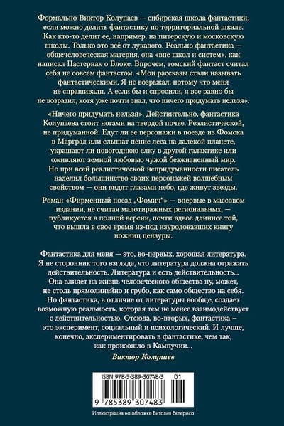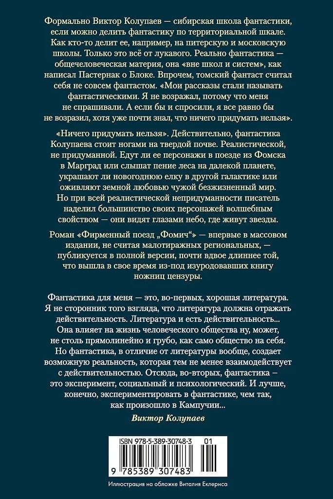 «Ничего придумать нельзя». Действительно, фантастика Колупаева стоит ногами на твердой почве. Реалистической, не придуманной. Едут ли ее персонажи в поезде из Фомска в Марград или слышат пение леса на далекой планете, украшают ли новогоднюю елку в другой галактике или оживляют земной любовью чужой безжизненный мир. Но при всей реалистической непридуманности писатель наделил большинство своих персонажей волшебным свойством — они видят глазами небо, где живут звезды.