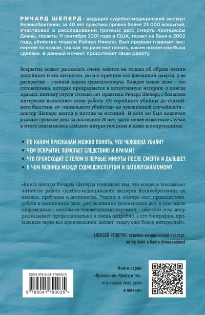 Тело человека — это безмолвный свидетель случившейся смерти, оно ничего не скрывает и всегда несет в себе правду. Когда смерть внезапна и необъяснима, доктор Ричард Шеперд обязательно выясняет ее причину. Каждое вскрытие — это отдельная детективная история, и автор с помощью проницательности разрешает головоломку, чтобы ответить на самый насущный вопрос: как этот человек умер?