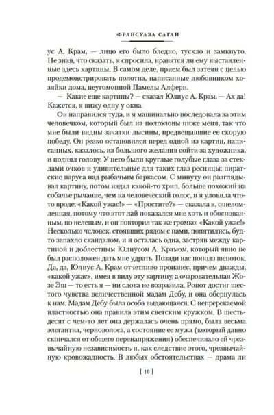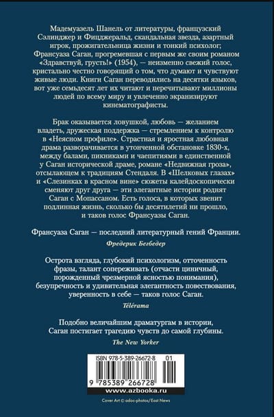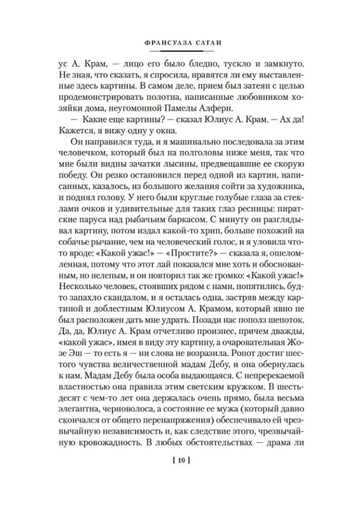 Брак оказывается ловушкой, любовь — желанием владеть, дружеская поддержка — стремлением к контролю в «Неясном профиле». Страстная и яростная любовная драма разворачивается в утонченной обстановке 1830-х, между балами, пикниками и чаепитиями в единственной у Саган исторической драме, романе «Недвижная гроза», отсылающем к традициям Стендаля. В «Шелковых глазах» и «Слезинках в красном вине» сюжеты калейдоскопически сменяют друг друга — эти элегантные истории роднят Саган с Мопассаном. Есть голоса, в которых звенит подлинная жизнь, сколько бы десятилетий ни прошло, и таков голос Франсуазы Саган.