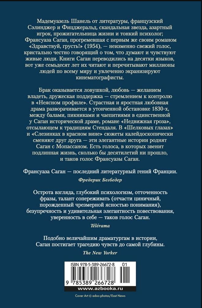 Мадемуазель Шанель от литературы, французский Сэлинджер и Фицджеральд, скандальная звезда, азартный игрок, прожигательница жизни и тонкий психолог; Франсуаза Саган, прогремевшая с первым же своим романом «Здравствуй, грусть!» (1954), — неизменно свежий голос, кристально честно говорящий о том, что думают и чувствуют живые люди. Книги Саган переводились на десятки языков, вот уже семьдесят лет их читают и перечитывают миллионы людей по всему миру и увлеченно экранизируют кинематографисты.