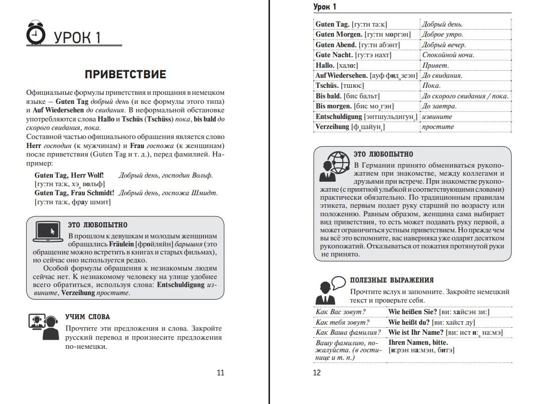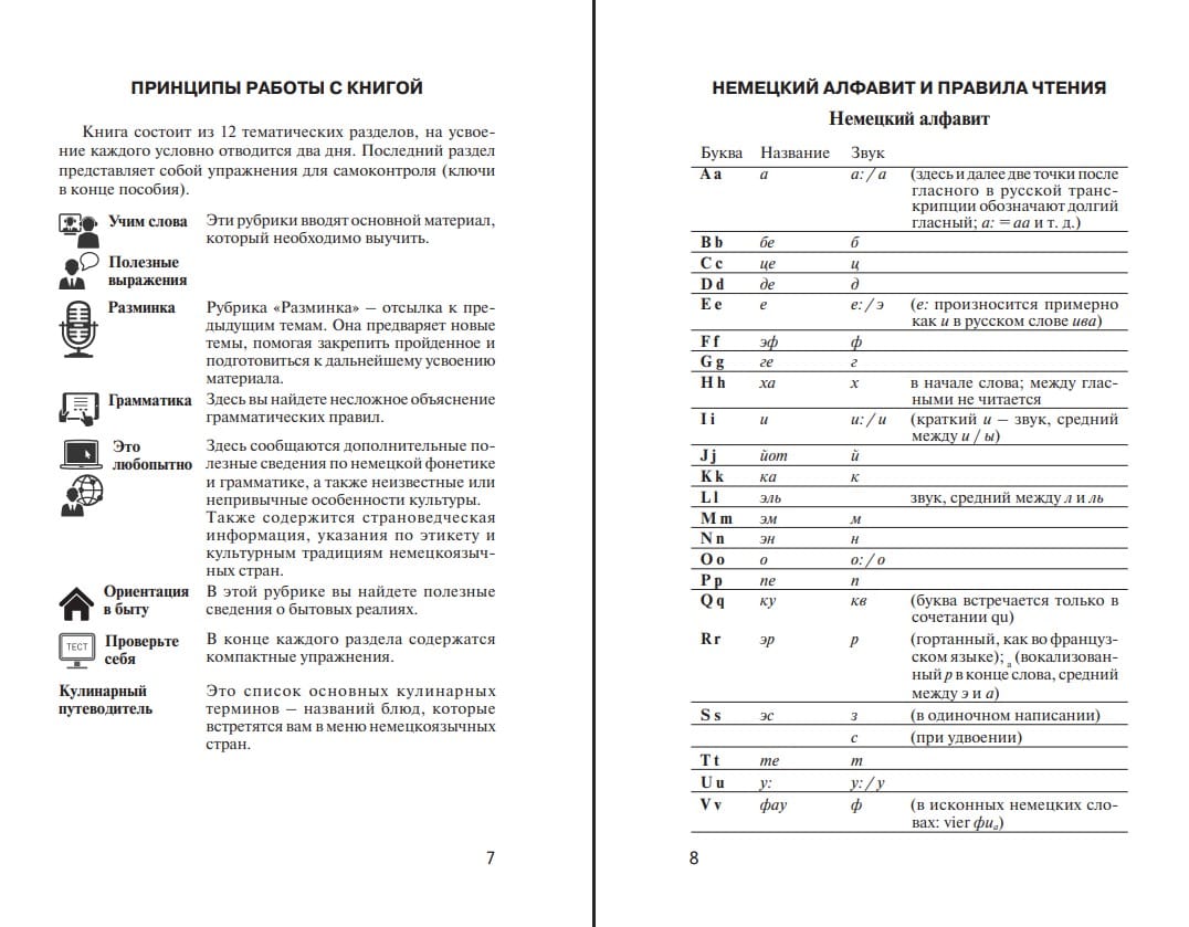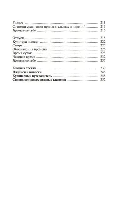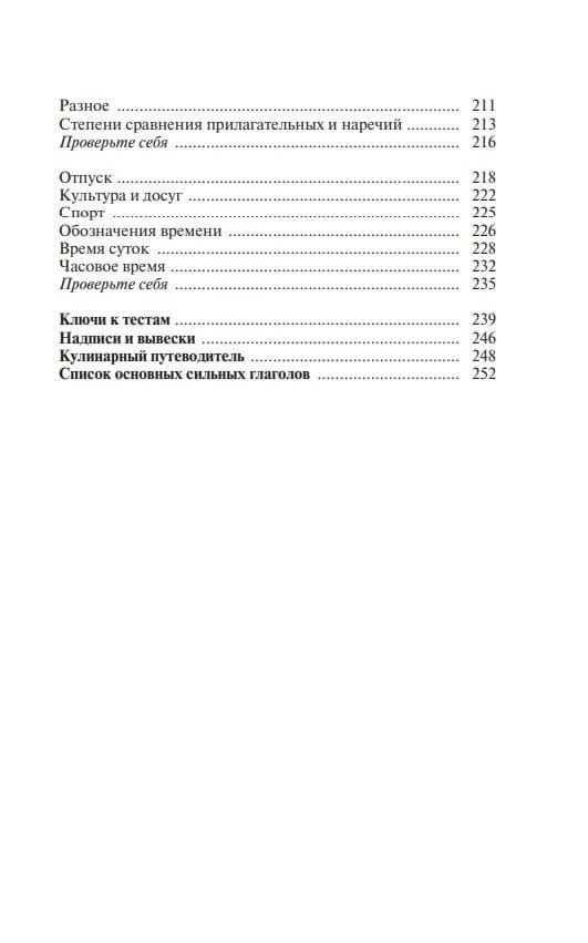Данный самоучитель предназначен для интенсивного обучения немецкому языку – устной речи, чтению, пониманию и общению. Книга состоит из тематических разделов, которые охватывают лексику по важнейшим бытовым темам. Теоретическая часть сопровождается тестами, которые способствуют закреплению изученного на практике. Для проверки правильности их выполнения в конце книги даны ключи. Пособие также содержит полезную страноведческую информацию о Германии, кулинарный словарик и список сильных и неправильных глаголов.