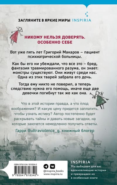 Вот уже пять лет Григорий Макаров — пациент психиатрической больницы. Как бы его ни убеждали, что все это — бред, фантазия травмированного разума, он знает: монстры существуют. Они живут среди нас. Одна из этих тварей забрала его дочь. Тогда ему никто не поверил, а теперь следствию нужна его помощь, иначе еще две девочки погибнут так же, как она.