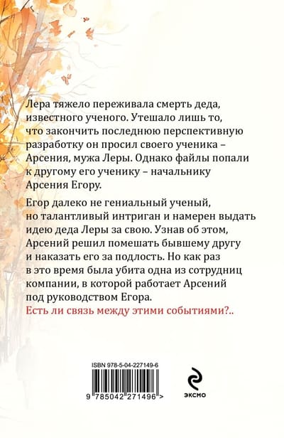 Лера тяжело переживала смерть деда, известного ученого. Утешало лишь то, что закончить последнюю перспективную разработку он просил своего ученика – Арсения, мужа Леры. Однако файлы попали к другому его ученику – начальнику Арсения Егору. Егор далеко не гениальный ученый, но талантливый интриган и намерен выдать идею деда Леры за свою. Узнав об этом, Арсений решил помешать бывшему другу и наказать его за подлость. Но как раз в это время была убита одна из сотрудниц компании, в которой работает Арсений под руководством Егора. Есть ли связь между этими событиями?..