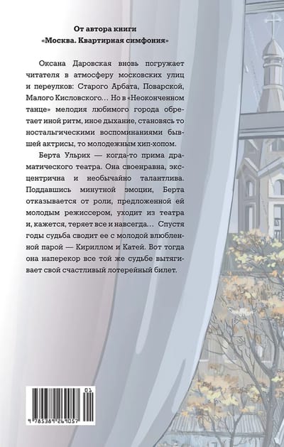 От автора книги «Москва. Квартирная симфония». Оксана Даровская вновь погружает читателя в атмосферу московских улиц и переулков: Старого Арбата, Поварской, Малого Кисловского… Но в «Неоконченном танце» мелодия любимого города обретает иной ритм, иное дыхание, становясь то ностальгическими воспоминаниями бывшей актрисы, то молодежным хип-хопом.
