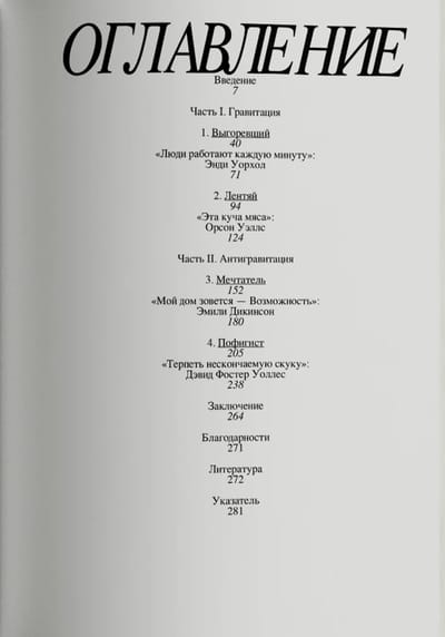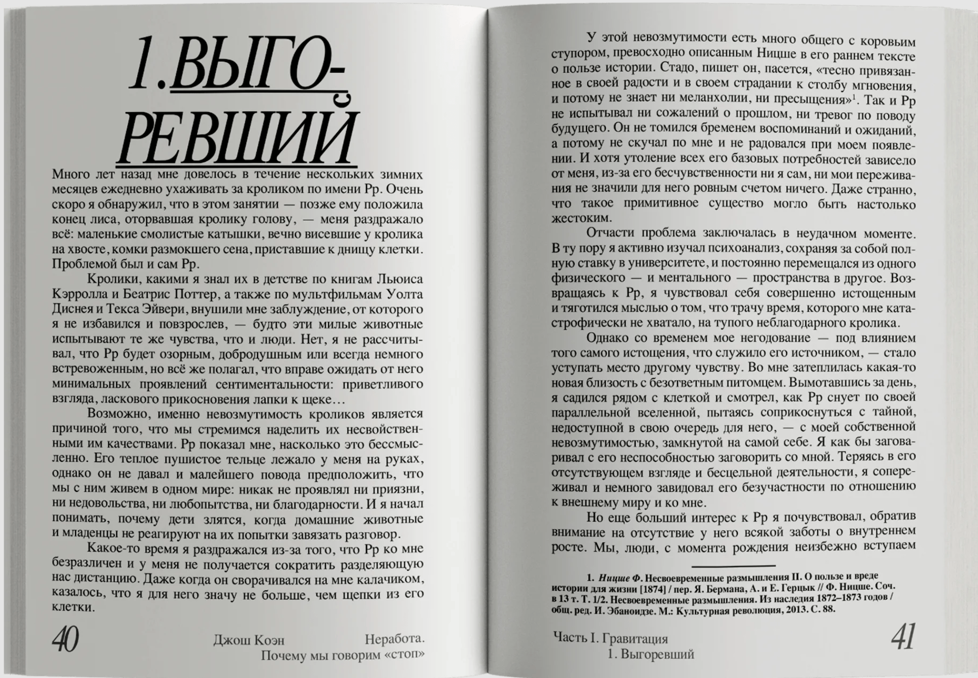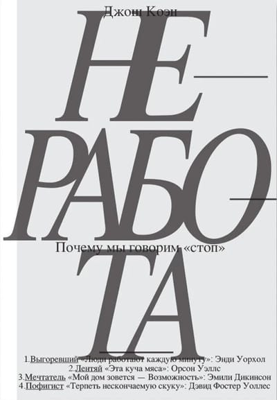 Книга британского психоаналитика Джоша Коэна посвящена нашим отношениям с трудом, точнее — заложенному в каждом из нас желанию не работать, которое отнюдь не безоблачно сосуществует с желанием работать — и добиваться успеха, престижа, благополучия, — причем, как полагает автор, является не менее, а возможно, и более важным, даже определяющим для человека. Это желание знакомо нам с детства, когда оно с легкостью удовлетворяется, но мы учимся подавлять его и привыкаем отдавать все силы работе, порой забывая, что жизнь ею не исчерпывается. Иногда результатом становятся большие достижения в избранной нами профессии, иногда — депрессия, иногда то и другое вместе. Как быть с потребностью в «неработе», которую невозможно реализовать в полной мере, но и отрицать, задавливать в себе, крайне опасно? Автор ищет подступы к ответу на этот, должно быть, неразрешимый вопрос в собственном жизненном опыте, в историях своих пациентов и в судьбах нескольких выдающихся людей, столкнувшихся с конфликтом между работой и «неработой» вплотную, — Эмили Дикинсон, Орсона Уэллса, Энди Уорхола и Дэвида Фостера Уоллеса. Из автобиографических очерков, заметок психоаналитика и тонких наблюдений о природе творчества складывается этот текст, продиктованный стремлением Джоша Коэна разобраться в себе и способный помочь в этом нам.