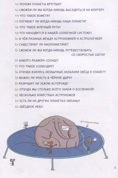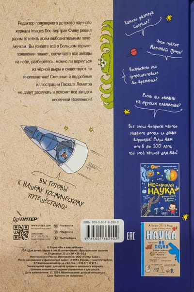 Редактор популярного детского научного журнала Images Doc Бертран Фишу решил разом ответить всем любознательным почемучкам. Вы узнаете всё о Большом взрыве, появлении планет, сосчитаете все звёзды на небе, разберетесь, можно ли вернуться из черной дыры и существуют ли инопланетяне! Смешные и подробные иллюстрации Паскаля Леметра не дадут заскучать и пояснят все загадки нескучной Вселенной!