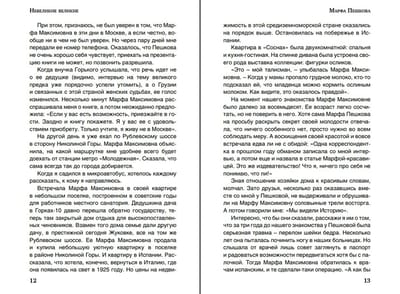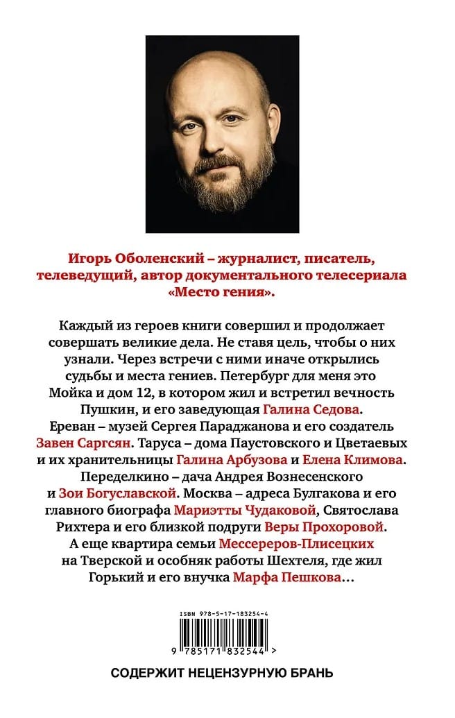 «Каждый из героев книги совершил и продолжает совершать великие дела. Не ставя цель, чтобы о них узнали. Через встречи с ними иначе открылись судьбы и места гениев. Петербург для меня это улица Мойка и дом 12, в котором жил и встретил вечность Пушкин, и его заведующая Галина Седова. Ереван — музей Сергея Параджанова и его создатель Завен Саргсян. Таруса — дома Паустовского и Цветаевых и их хранительницы Галина Арбузова и Елена Климова. Кисловодск — особняки, уцелевшие благодаря Борису Розенфельду. Переделкино — дача Андрея Вознесенского и Зои Богуславской. Ташкент — Малик Каюмов, участник вскрытия гробницы Тамерлана. Москва — адреса Булгакова и его главного биографа Мариэтты Чудаковой, Маяковского и Александра Ушакова, Святослава Рихтера и его близкой подруги Веры Прохоровой, квартира Мессереров–Плисецких на Тверской и особняк работы Шехтеля, где жил Горький и его внучка Марфа Пешкова…» (Игорь Оболенский).