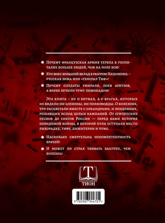 Почему французская армия теряла в госпиталях больше людей, чем на поле боя? Кто внес больший вклад в разгром Наполеона — русская зима или «генерал Тиф»? Почему солдаты умирали, поев арбузов, а врачи лечили чуму лимонадом? Эта книга — не о битвах, а о врагах, которых не видели ни шпионы, ни полководцы. О болезнях, что расцветали вместе с олеандрами, и эпидемиях, решавших исход целых кампаний. От египетских песков до снегов России — перед вами история невидимой войны, в которой пули уступали место лихорадке, тифу, дизентерии и чуме. Насколько смертельна некомпетентность врачей? И может ли страх убивать быстрее, чем болезнь?