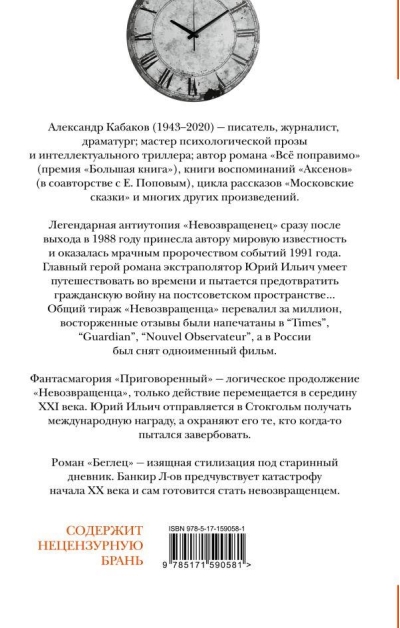 Александр Кабаков (1943–2020) — писатель, журналист, драматург; мастер психологической прозы и интеллектуального триллера; автор романа «Всё поправимо» (премия «Большая книга»), книги воспоминаний «Аксенов» (в соавторстве с Е.Поповым), ироничных «Московских сказок» и многих других произведений.Легендарная антиутопия «Невозвращенец» сразу после выхода в 1988 году принесла автору мировую известность и оказалась мрачным пророчеством событий 1991 года. Главный герой романа экстраполятор Юрий Ильич умеет путешествовать во времени и пытается предотвратить гражданскую войну на постсоветском пространстве… Общий тираж «Невозвращенца» перевалил за милллион, восторженные отзывы были напечатаны в “Times”, “Guardian”, “Nouvel Observateur”, а в России был снят одноименный фильм.Фантасмагория «Приговоренный» — логическое продолжение «Невозвращенца», только действие перемещается в середину XXI века. Юрий Ильич отправляется в Стокгольм получать международную награду, а охраняют его те, кто когда-то пытался завербовать.Роман «Беглец» — изящная стилизация под старинный дневник. Банкир Л-ов предчувствует катастрофу начала ХХ века и сам готовится стать невозвращенцем.
