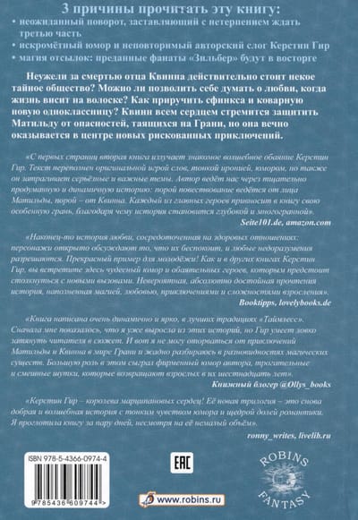 Неужели за смертью отца Квинна действительно стоит некое тайное общество? Можно ли позволить себе думать о любви, когда жизнь висит на волоске? Как приручить сфинкса и коварную новую одноклассницу? Квинн всем сердцем стремится защитить Матильду от опасностей, таящихся на Грани, но она вечно оказывается в центре новых рискованных приключений.