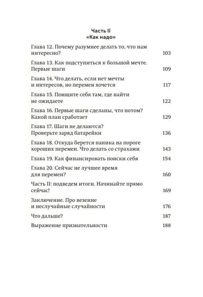 Вдохновляющая книга о том, как решиться на перемены, набраться смелости сменить нелюбимую работу, перестать откладывать свою жизнь на потом. Мотивирует и дает план, помогающий решить проблему «хочу, но не знаю, с чего начать». Вы найдете здесь много полезных практических техник, помогающих разобраться в себе, преодолеть инерцию и начать действовать.