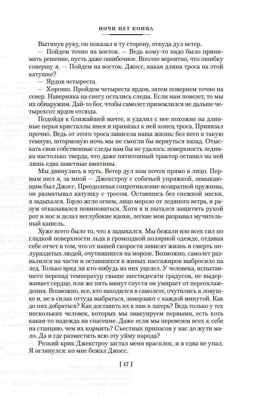Настоящий сборник объединяет тема Арктики, и открывает его роман «Ночи нет конца». Авиалайнер терпит крушение в Гренландии. Сотрудники метеостанции спешат на помощь пассажирам, и обстоятельства катастрофы заставляют предположить, что среди выживших есть убийца... С полярной станции в Ледовитом океане поступает сигнал бедствия, и в этот район направляется атомная субмарина («Дрейфующая станция „Зет“»). В ходе сложнейшей спасательной операции счет идет на часы... На отдаленный остров в Баренцевом море везут съемочную группу, но сценарий для большинства остается тайной («Остров Медвежий»). Во время плавания внезапно умирает несколько человек, и возникает подозрение, что выбор жертв не случаен... В романе «Атабаска» действие происходит на Аляске. Нефтяная компания получает анонимную угрозу саботажа, но расследование заходит в тупик...