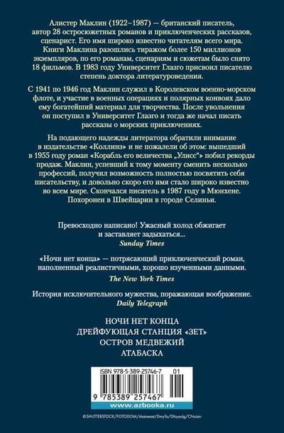 Алистер Маклин (1922–1987) — британский писатель, автор 28 остросюжетных романов и приключенческих рассказов, сценарист. Его имя широко известно читателям всего мира. Книги Маклина разошлись тиражом более 150 миллионов экземпляров, по его романам, сценариям и сюжетам было снято 18 фильмов. В 1983 году Университет Глазго присвоил писателю степень доктора литературоведения. С 1941 по 1946 год Маклин служил на флоте, принимал участие в военных операциях и полярных конвоях, что дало ему богатейший материал для творчества и определило тематику его лучших книг.