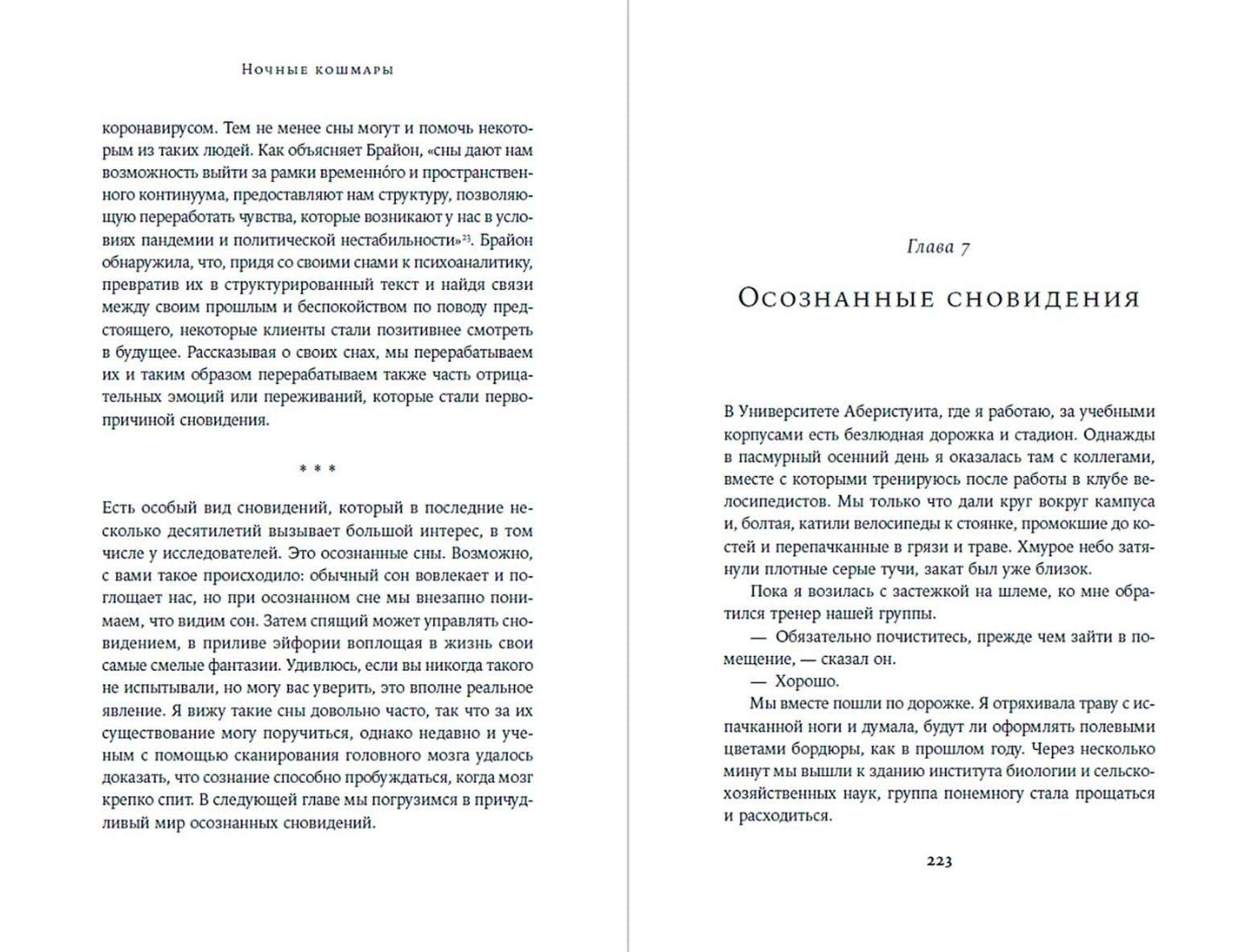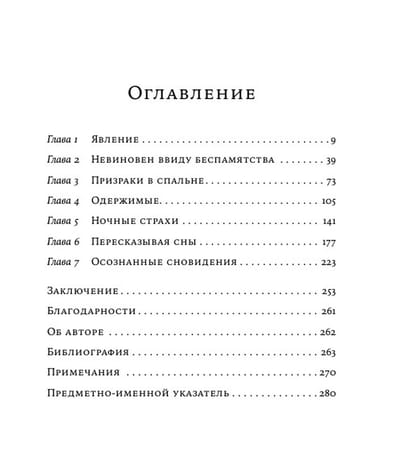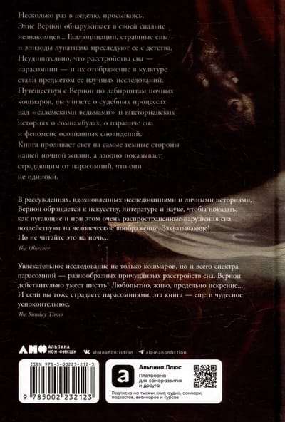 Элис Вернон, автор книги «Ночные кошмары», несколько раз в неделю, просыпаясь, обнаруживает в своей спальне незнакомцев. Ее с детства преследуют зловещие галлюцинации, страшные сны и эпизоды лунатизма. Неудивительно, что расстройства сна — парасомнии — и их репрезентация в культуре стали предметом ее научных изысканий. Она исследует, как на протяжении истории эти расстройства осмысляли и пытались лечить, как рассказы о них приводили к стигматизации, увековечивали моменты истории, ложились в основу увлекательных книг и киносценариев и использовались в терапевтической практике. Путешествуя по лабиринтам ночных кошмаров, вы узнаете о судебных процессах над «салемскими ведьмами», о параличе сна, викторианских историях о сомнамбулах и феномене осознанных сновидений.