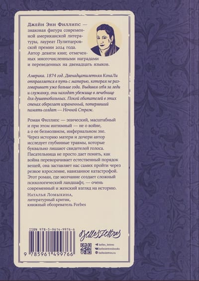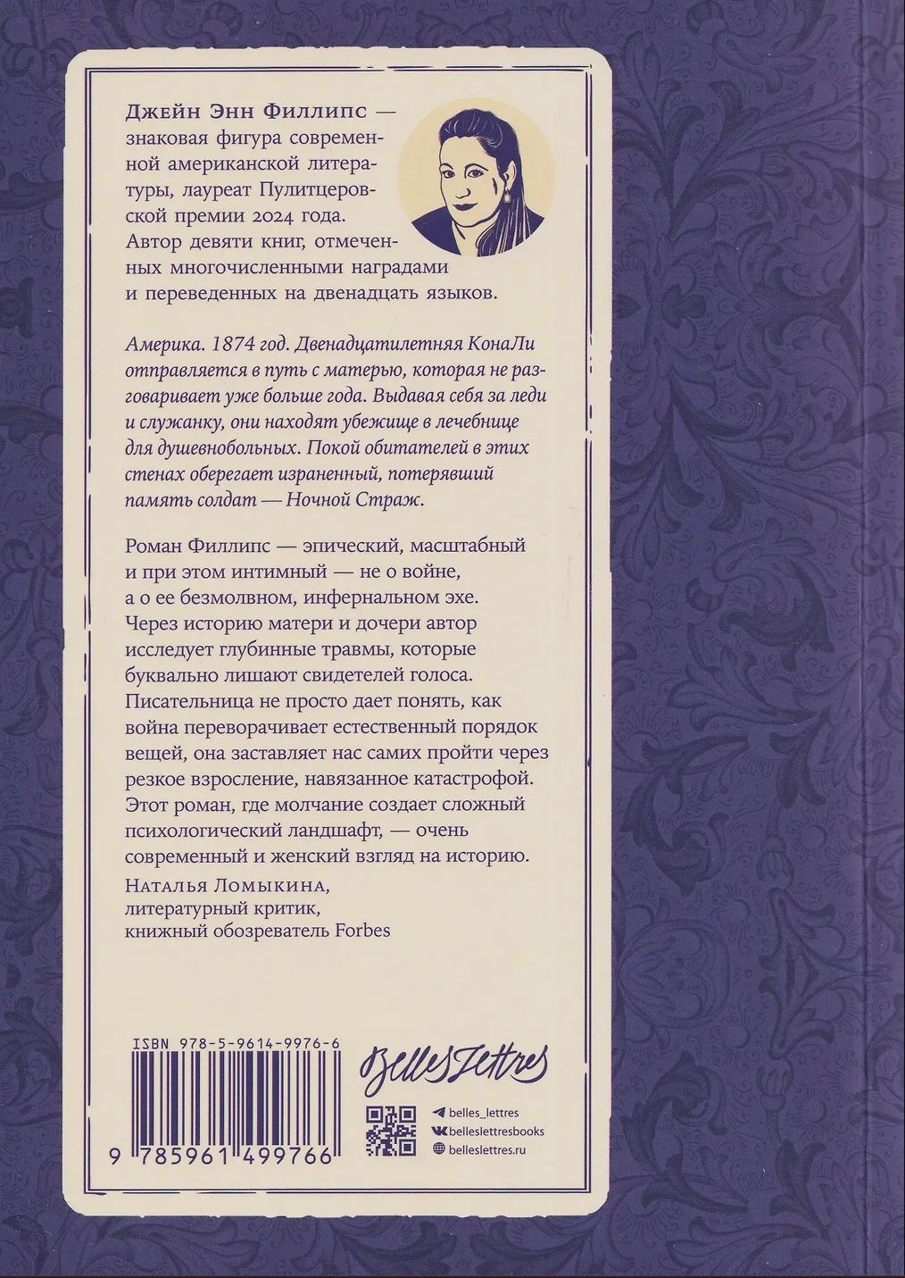 Роман Джейн Энн Филлипс, удостоенный Пулитцеровской премии, — не только пронзительная историческая драма, но и гимн милосердию и глубокое осмысление уязвимости и стойкости женщин в оглушенном насилием мире. Сочетая поэтичность языка с точностью документальной хроники, писательница исследует хрупкость человеческого духа и раскрывает исцеляющую силу сострадания.