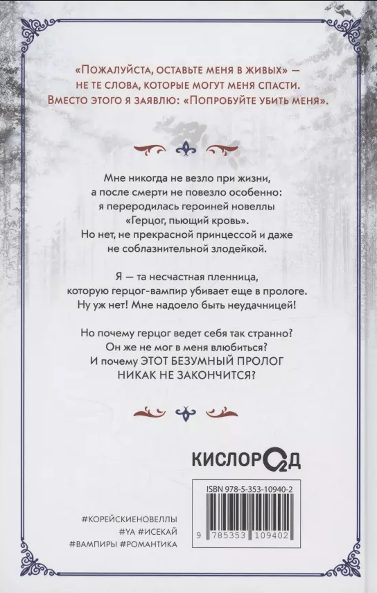 Мне никогда не везло при жизни, а после смерти не повезло особенно: я переродилась героиней новеллы «Герцог, пьющий кровь». Но нет, не прекрасной принцессой и даже не соблазнительной злодейкой. Я — та несчастная пленница, которую герцог-вампир убивает еще в прологе.
