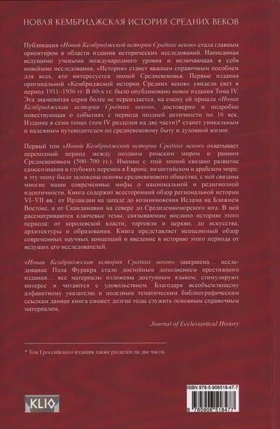 Первый том Новой Кембриджской истории Средних веков охватывает переходный период между поздним римским миром и ранним Средневековьем (500–700 гг.). Именно с этой эпохой связано развитие самосознания и глубоких перемен в Европе, византийском и арабском мире; в эту эпоху были заложены основы средневекового общества; с ней связаны многие наши современные мифы о национальной и религиозной идентичности. Книга содержит всесторонний обзор региональной истории VI–VII вв.: от Ирландии на западе до возникновения Ислама на Ближнем Востоке, и от Скандинавии на севере до Средиземноморского юга. В ней рассматриваются ключевые темы, связывающие воедино историю этого периода: от королевской власти, торговли и церкви, до искусства, архитектуры и образования. Книга представляет неоценимый обзор современных научных концепций и введение в историю этого периода от ведущих его исследователей.