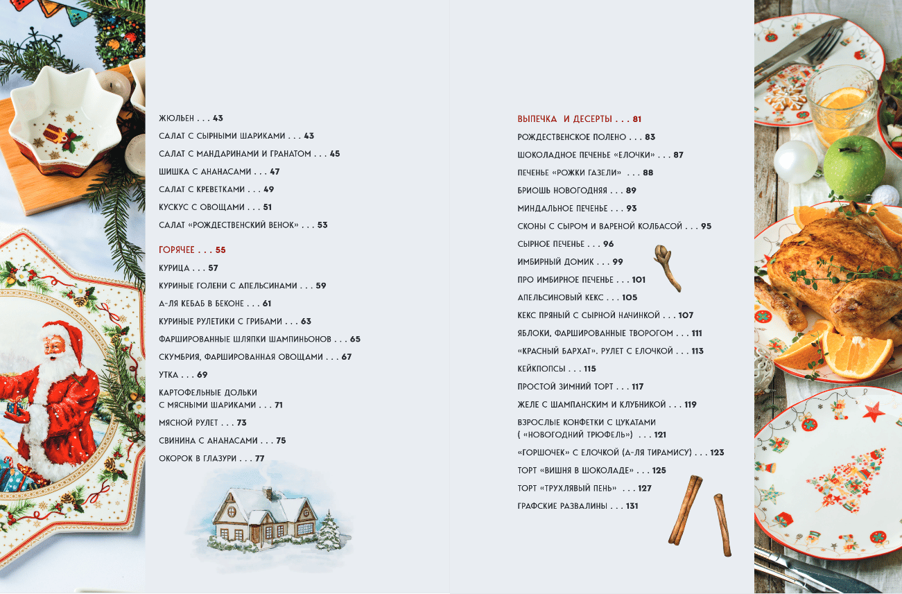 - И куда же без сладкого: «Красный бархат», рулет с елочкой, имбирный домик и миндальный штоллен.