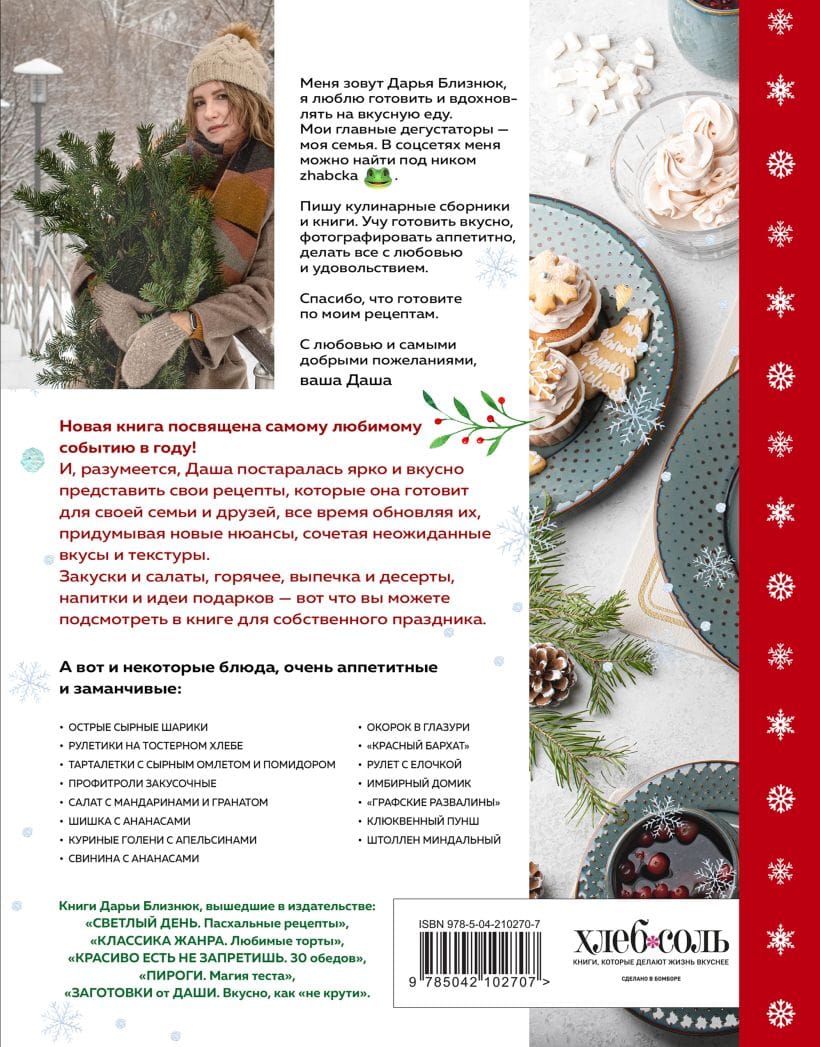 Новое оформление новогодней книги! Дарья Близнюк, известная в социальных сетях как zhabcka, у которой вышло уже пять кулинарных книг, посвятила эту книгу самому любимому событию в году и постаралась ярко и вкусно представить новогодние рецепты, которые она готовит для своей семьи и друзей, все время обновляя их, придумывая новые нюансы, сочетая неожиданные вкусы и текстуры. Рецепты подробно описаны и красочно проиллюстрированы авторскими фото. Закуски и салаты, горячее, выпечка и десерты, напитки и идеи подарков — вот что вы можете подсмотреть в книге для собственного праздника.