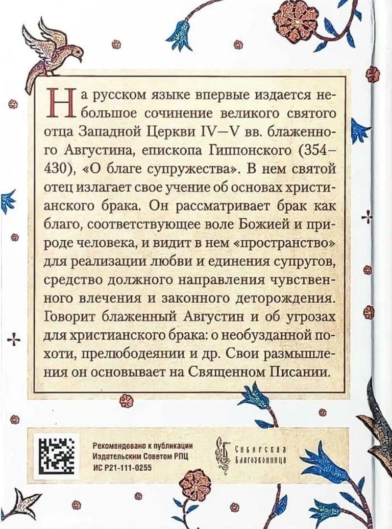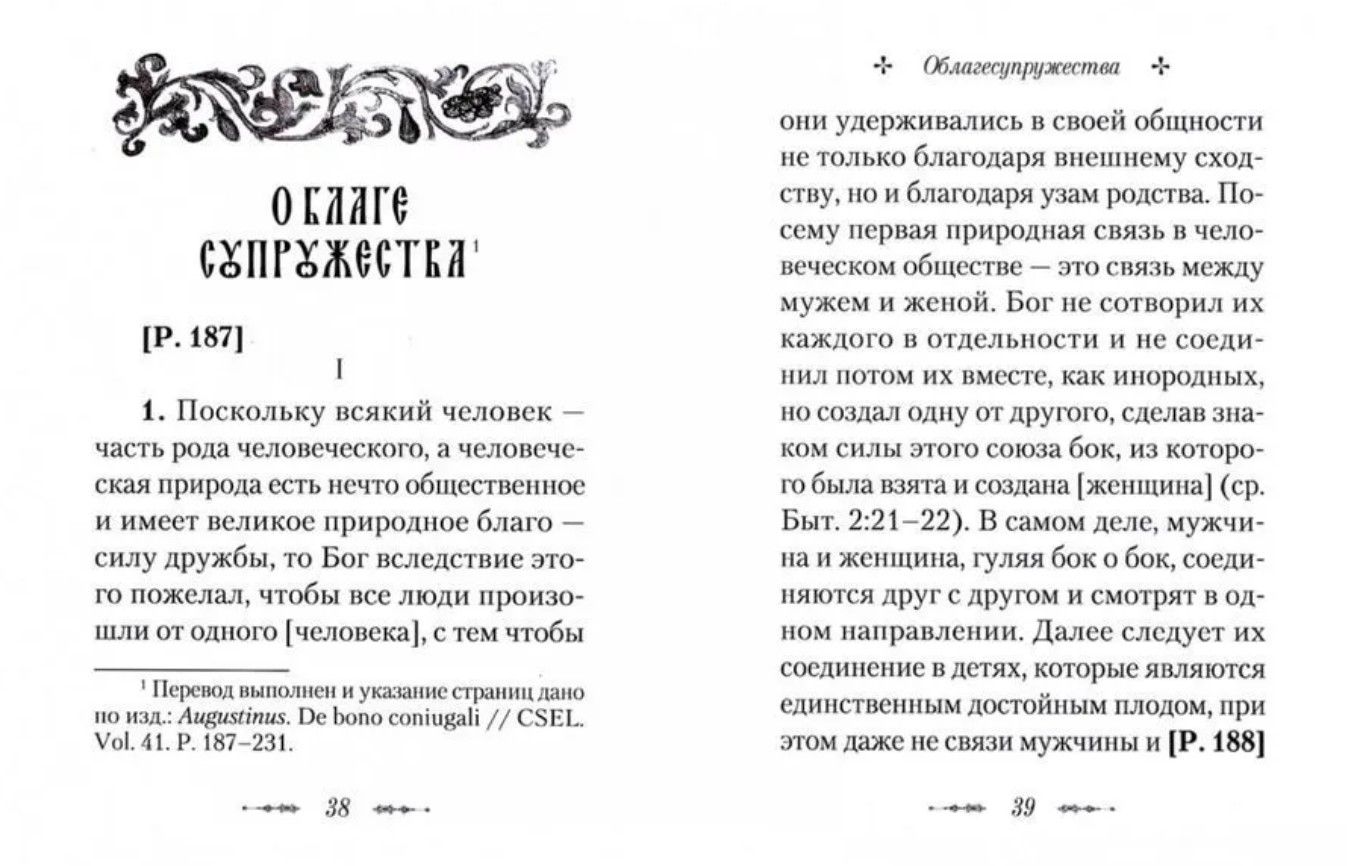 На русском языке впервые издается небольшое сочинение великого святого отца Западной Церкви?IV–V вв. блаженного Августина, епископа Гиппонского (354–430), «О благе супружества». В нем святой отец излагает свое учение об основах христианского брака. Он рассматривает брак как благо, соответствующее воле Божией и природе человека, и видит в нем «пространство» для реализации любви и единения супругов, средство должного направления чувственного влечения и законного деторождения. Говорит блаженный Августин и об угрозах для христианского брака: необузданной похоти, прелюбодеянии и др. Свои размышления он основывает на Священном Писании.