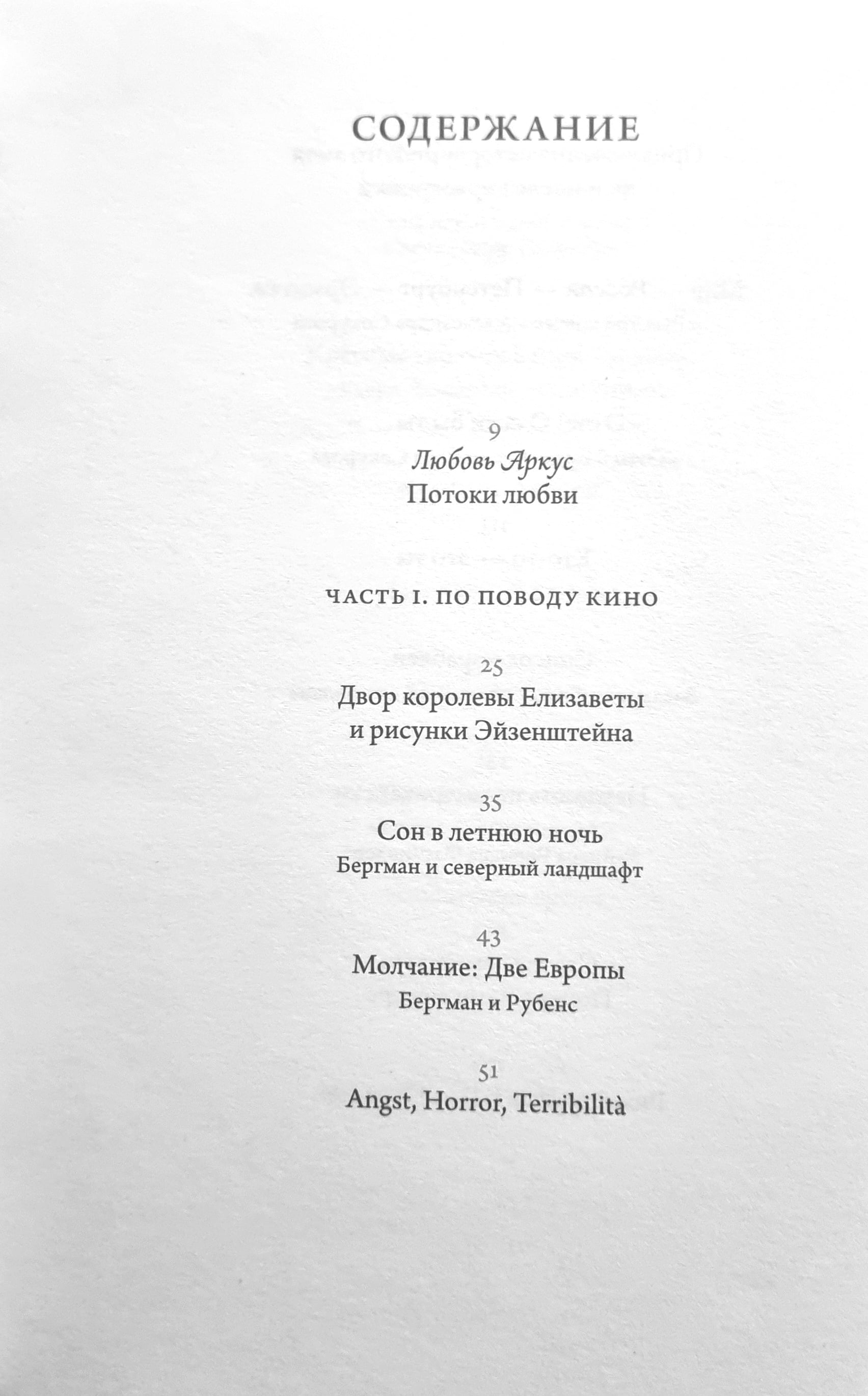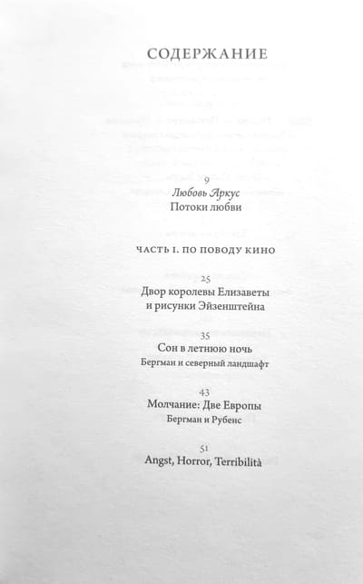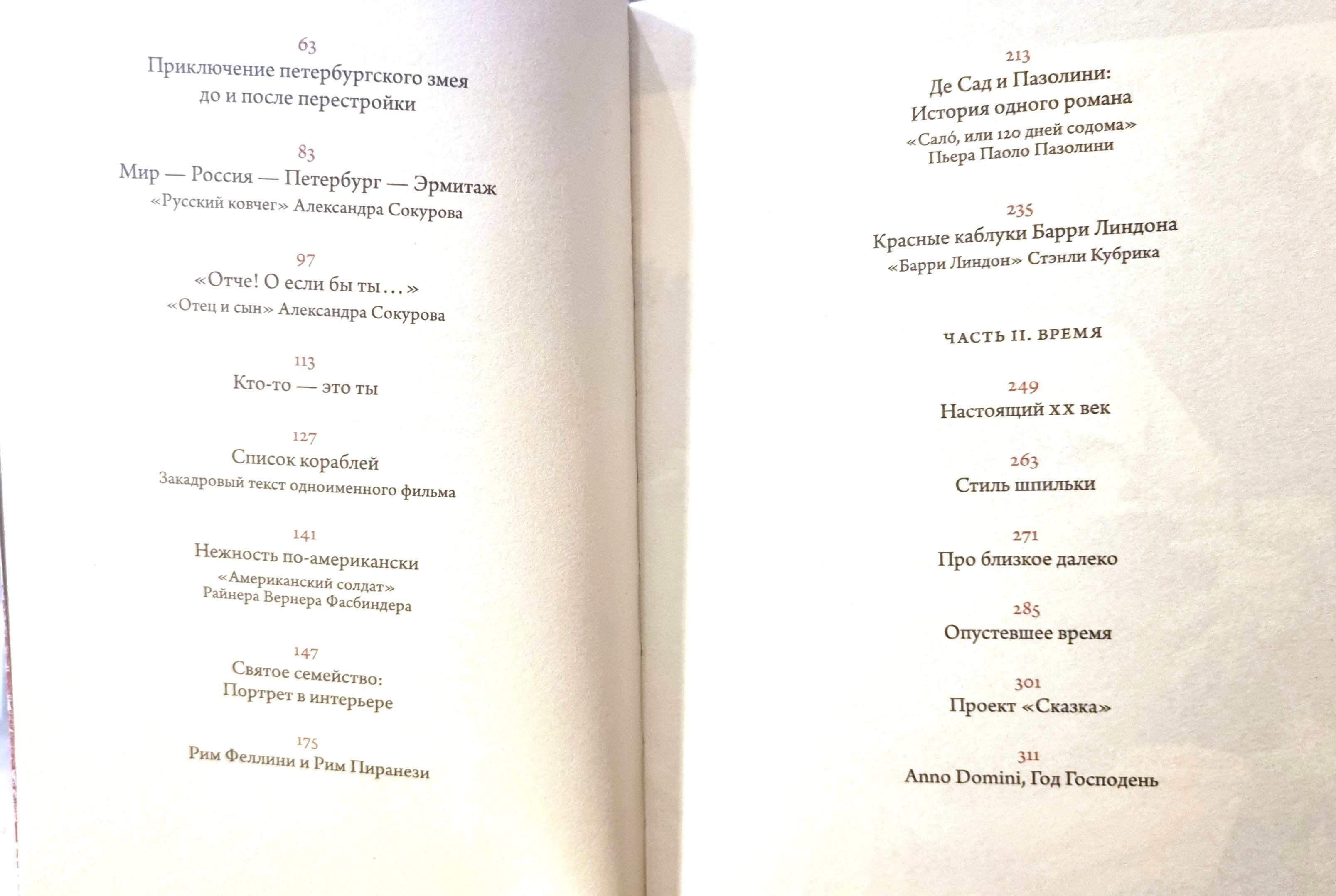Первую часть составили тексты, поводом для создания которых стал конкретный фильм, жанр или образ; они приводятся в порядке их появления в печати. Вторая часть — размышления о духе времени: от общего взгляда на XX век к сути стиля 1960‑х, советскому застою, 1990‑м и, наконец, началу XXI века. Предисловием служат воспоминания основателя «Сеанса» Любови Аркус, которая рассказывает об ушедшем друге.