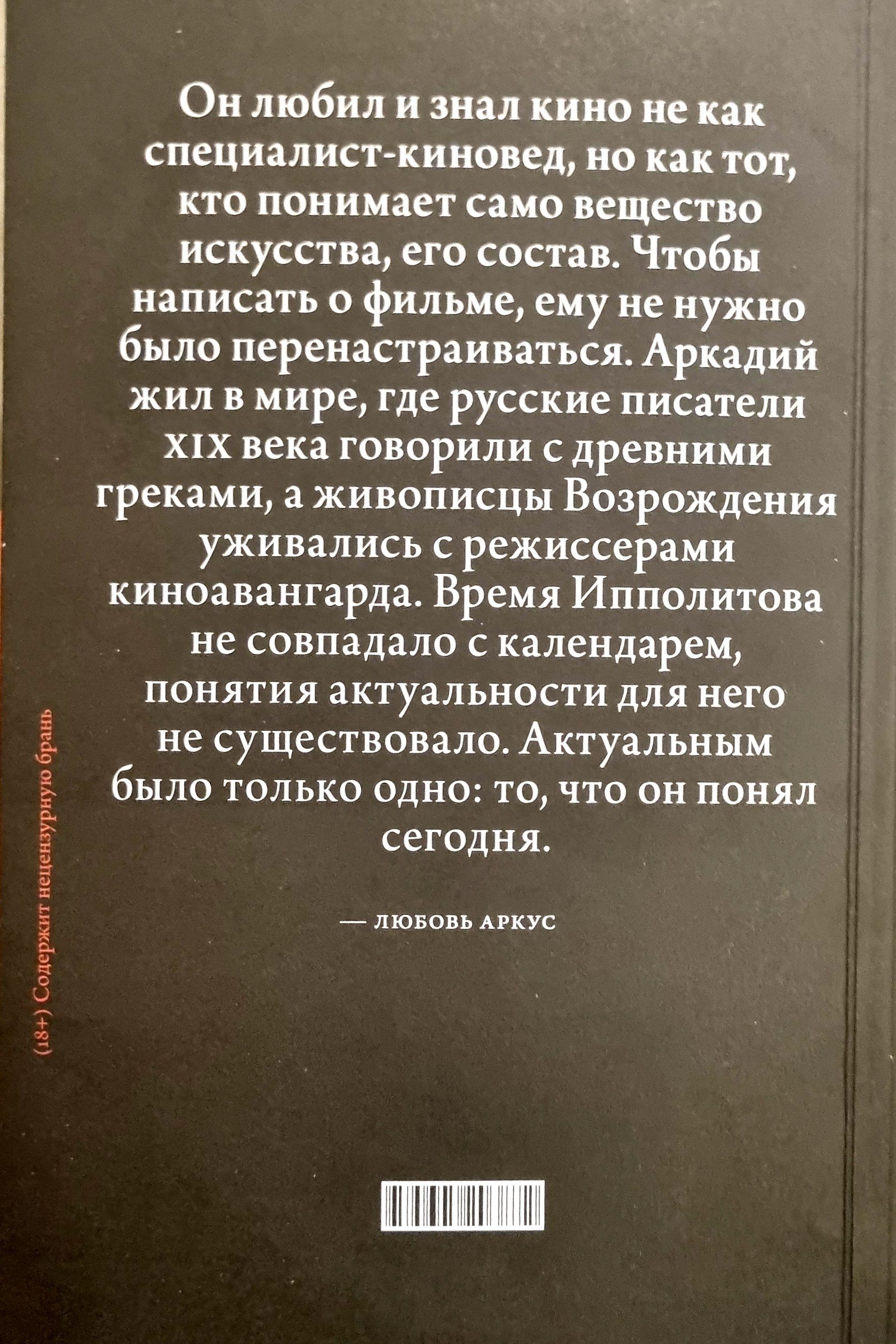 Аркадий Викторович Ипполитов известен широкому кругу читателей прежде всего как искусствовед и куратор, хранитель кабинета итальянской гравюры Эрмитажа, а также уникальный эссеист, исследователь «образов Италии». О других его интересах знают меньше: на протяжении нескольких десятилетий он сотрудничал с журналом «Сеанс» как автор статей о кинематографе. Свой первый печатный текст он сочинил для «Сеанса» в 1993 году, а в 2008‑м именно «Сеанс» выпустил его первый сборник. В настоящую книгу вошли статьи, написанные Аркадием Ипполитовым по заказу редакции.