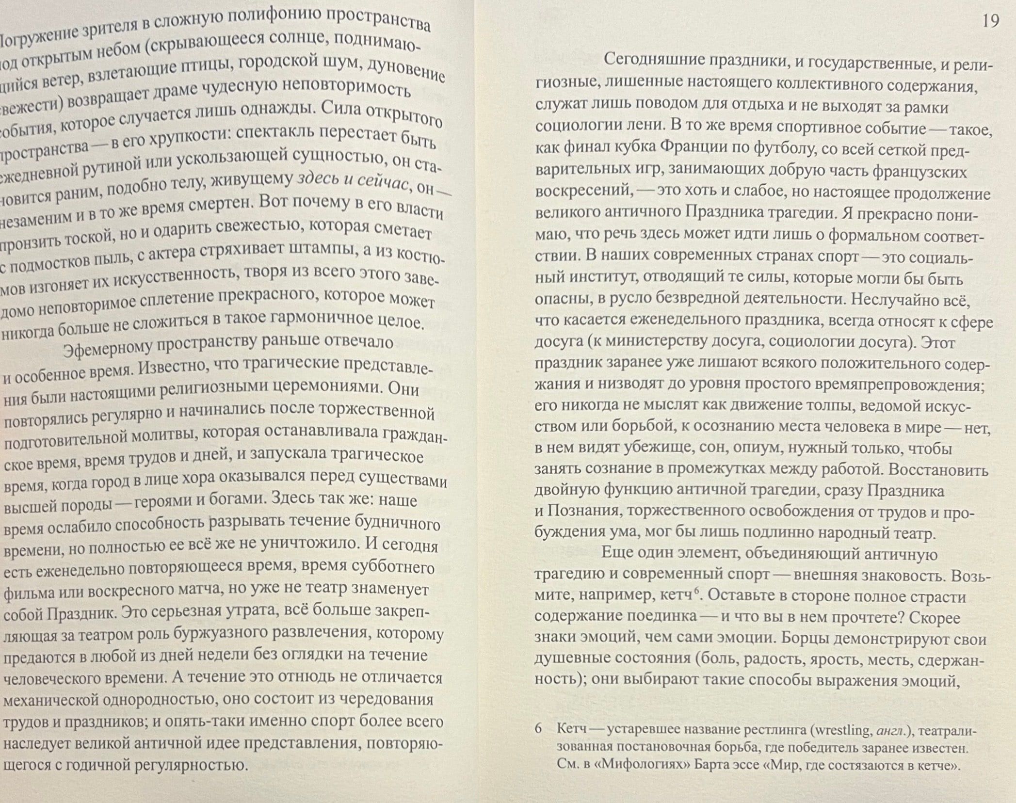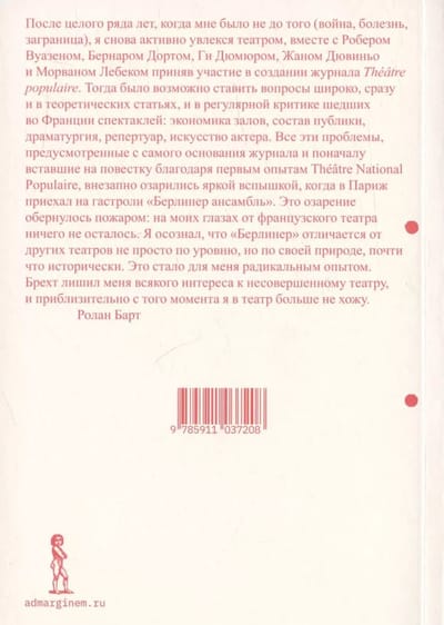 Ролан Барт мало известен нашему читателю как театральный критик. А между тем он был глубоко увлечен театром, и не только как зритель, но и как один из основателей и постоянных авторов журнала Théâtre populaire. Пятидесятые годы — время для французского театра исключительно важное, именно тогда намечаются те линии, которые составляют актуальный театральный пейзаж. Собранные здесь тексты, идет ли речь о критическом отзыве на давно позабытый спектакль, о политическом его звучании, теоретическом аспекте или экскурсе в историю, неизменно касаются самой сущности театра, а потому не теряют интереса и сегодня.