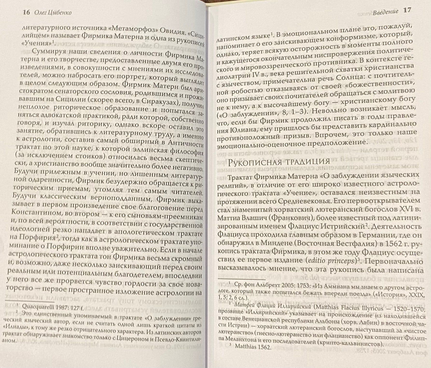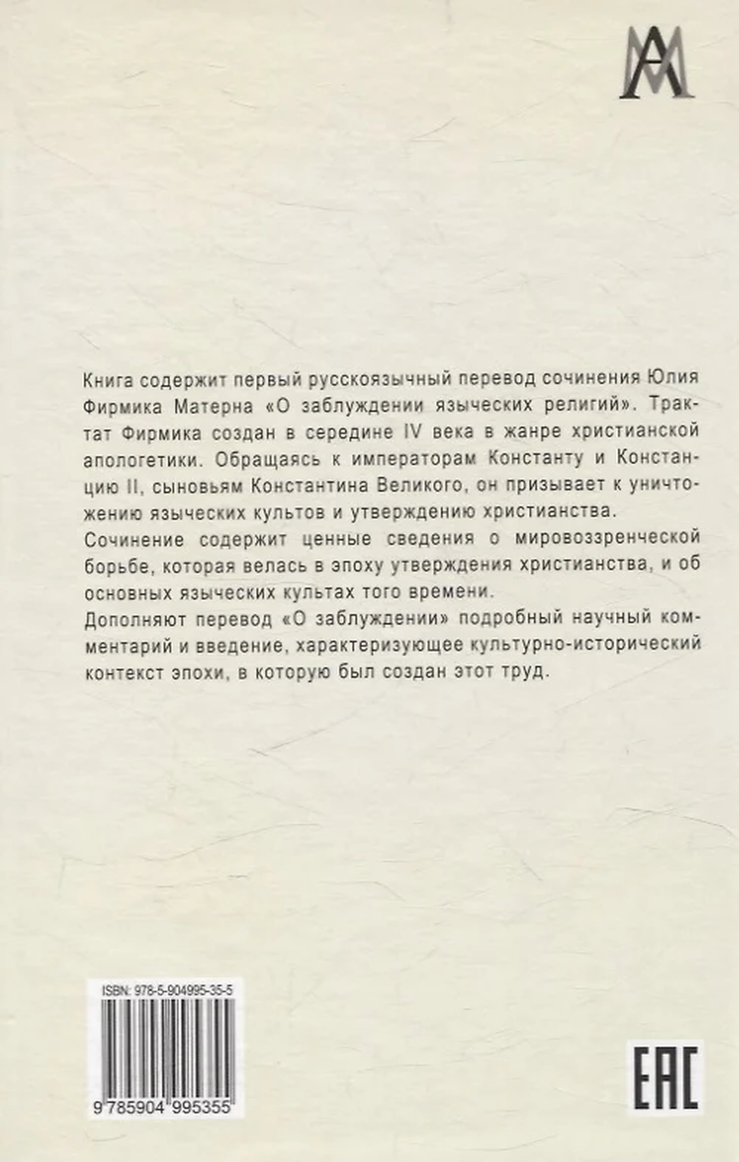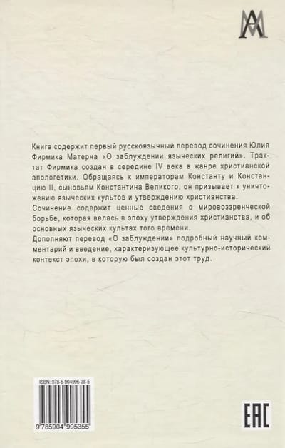 Книга содержит первый русскоязычный перевод сочинения Юлия Фирмика Матерна «О заблуждении языческих религий». Трактат Фирмика создан в середине IV века в жанре христианской апологетики. Обращаясь к императорам Константу и Констанцию II, сыновьям Константина Великого, он призывает к уничтожению языческих культов и утверждению христианства. Сочинение содержит ценные сведения о мировоззренческой борьбе, которая велась в эпоху утверждения христианства, и об основных языческих культах того времени. Дополняют перевод «О заблуждении» подробный научный комментарий и введение, характеризующее культурно- исторический контекст эпохи, в которую был создан этот труд.