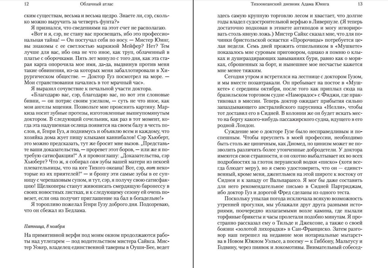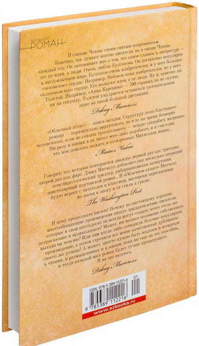 Современная классика, монументальный шедевр, вошедший, как и многие другие книги Митчелла, в шортлист Букеровской премии. В 2012 году роман был экранизирован Томом Тыквером и братьями Вачовски (в ролях Том Хэнкс, Хэлли Берри, Хью Грант, Джим Бродбент, Бен Уишоу, Хьюго Уивинг, Сьюзен Сарандон), став, при бюджете свыше 100 миллионов долларов, самым дорогим независимым фильмом в истории кинематографа. «Облачный атлас» подобен зеркальному лабиринту, в котором перекликаются, наслаиваясь друг на друга, шесть голосов: нотариуса середины девятнадцатого века, возвращающегося в США из Австралии; молодого композитора, вынужденного торговать душой и телом в Европе между мировыми войнами; журналистки в Калифорнии 1970-х, раскрывающей корпоративный заговор; мелкого издателя — нашего современника, умудрившегося сорвать банк на бандитской автобиографии «Удар кастетом» и бегущего от кредиторов; клона-прислуги из предприятия быстрого питания в Корее — стране победившего киберпанка; и гавайского козопаса на закате цивилизации.