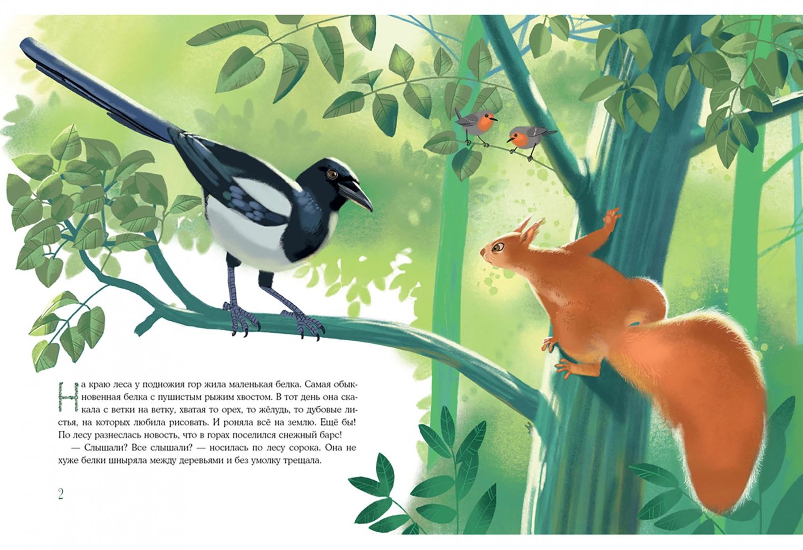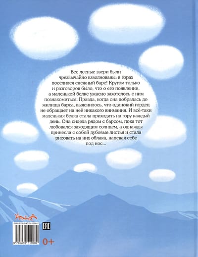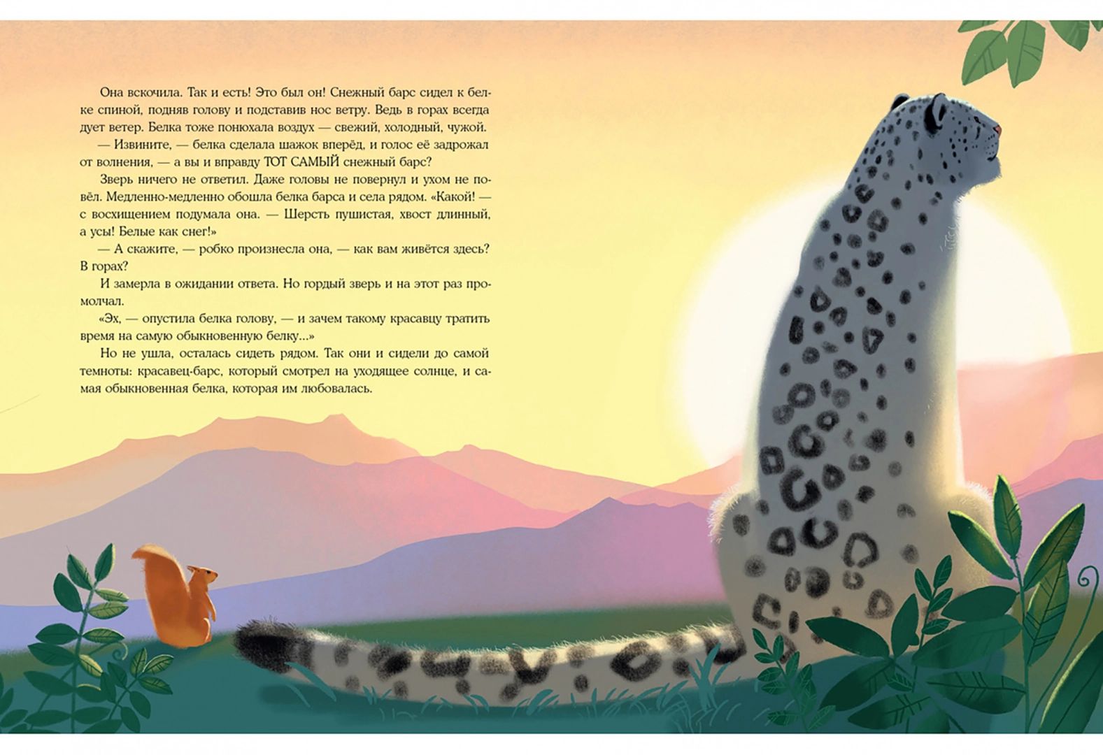 Все лесные звери были ужасно взволнованы: в горах поселился снежный барс. Кругом только и разговоров было, что о его появлении, а маленькой белке ужасно захотелось с ним познакомиться. Правда, когда она добралась до жилища барса, выяснилось, что одинокий гордец не обращает на неё никакого внимания. И всё-таки маленькая белка стала приходить на гору каждый день. Она сидела рядом с барсом, пока тот любовался заходящим солнцем, а однажды принесла с собой дубовые листья и стала рисовать на них облака, напевая себе под нос...