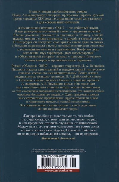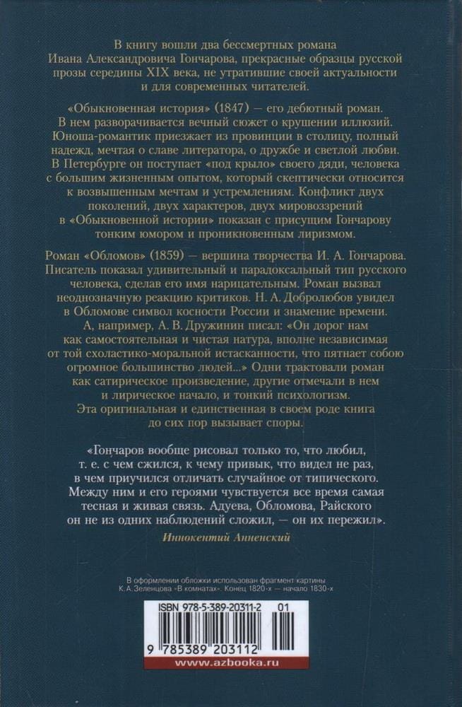 В книгу вошли два бессмертных романа Ивана Александровича Гончарова, одного из классиков русской литературы. «Обыкновенная история» (1847) — его дебютный роман. В нем разворачивается вечный сюжет о крушении иллюзий. Юноша-романтик приезжает из провинции в столицу, полный надежд, мечтая о славе литератора, о дружбе и светлой любви. В Петербурге он поступает «под крыло» своего дяди, человека с большим жизненным опытом, который скептически относится к возвышенным мечтам и устремлениям. Конфликт двух поколений, двух характеров, двух мировоззрений в «Обыкновенной истории» показан с присущим Гончарову тонким юмором и проникновенным лиризмом. Роман «Обломов» (1859) — вершина творчества И. А. Гончарова. Писатель показал удивительный и парадоксальный тип русского человека, сделав его имя нарицательным. Роман вызвал неоднозначную реакцию критиков. Н. А. Добролюбов увидел в Обломове символ косности России и знамение времени. А, например, А. В. Дружинин писал: «Он дорог нам как самостоятельная и чистая натура, вполне независимая от той схоластико-моральной истасканности, что пятнает собою огромное большинство людей...» Одни трактовали роман как сатирическое произведение, другие отмечали в нем и лирическое начало, и тонкий психологизм. Эта оригинальная и единственная в своем роде книга до сих пор вызывает споры. «Каждый из характеров, созданных Гончаровым, — идеальное обобщение человеческой природы», — отмечал Д. С. Мережковский. Романы Гончарова — прекрасные образцы русской прозы середины XIX века, не утратившие своей актуальности и для современных читателей.