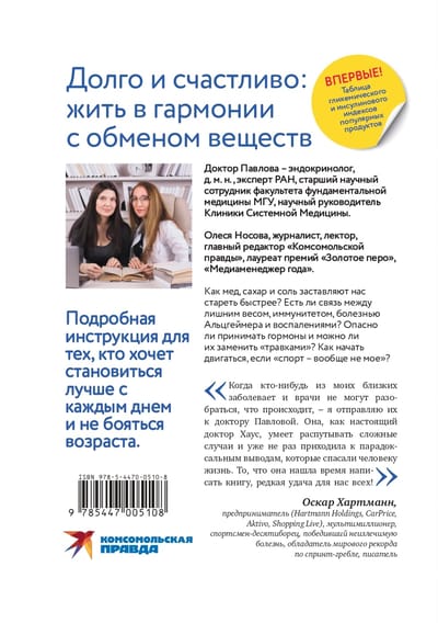 Подробная инструкция для тех, кто хочет улучшить здоровье и не бояться старости. Вы узнаете, как мед, сахар и соль заставляют нас стареть быстрее. Есть ли связь между лишним весом, иммунитетом, болезнью Альцгеймера и воспалениями? Опасно ли принимать гормоны и можно ли их заменить «травками»? Как начать двигаться, если «спорт - вообще не мое»? Автор книги доктор Павлова - эндокринолог, к. м. н., старший научный сотрудник факультета фундаментальной медицины МГУ, научный руководитель Клиники Системной Медицины. Как настоящий доктор Хаус, она умеет распутывать сложные случаи и уже не раз приходила к парадоксальным выводам, которые спасали человеку жизнь и помогали нормализовать обмен веществ. Читайте на здоровье!