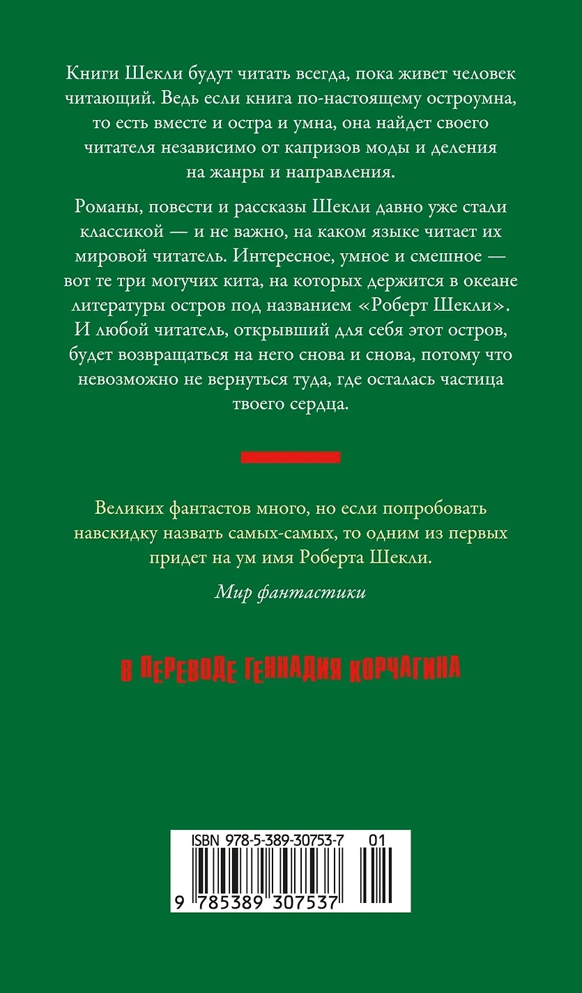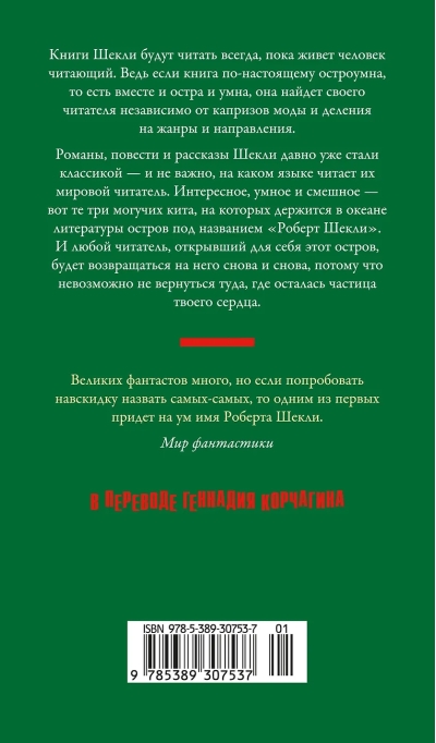 Романы, повести и рассказы Шекли давно уже стали классикой — и не важно, на каком языке читает их мировой читатель. Интересное, умное и смешное — вот те три могучих кита, на которых держится в океане литературы остров под названием «Роберт Шекли». И любой читатель, открывший для себя этот остров, будет возвращаться на него снова и снова, потому что невозможно не вернуться туда, где осталась частица твоего сердца.