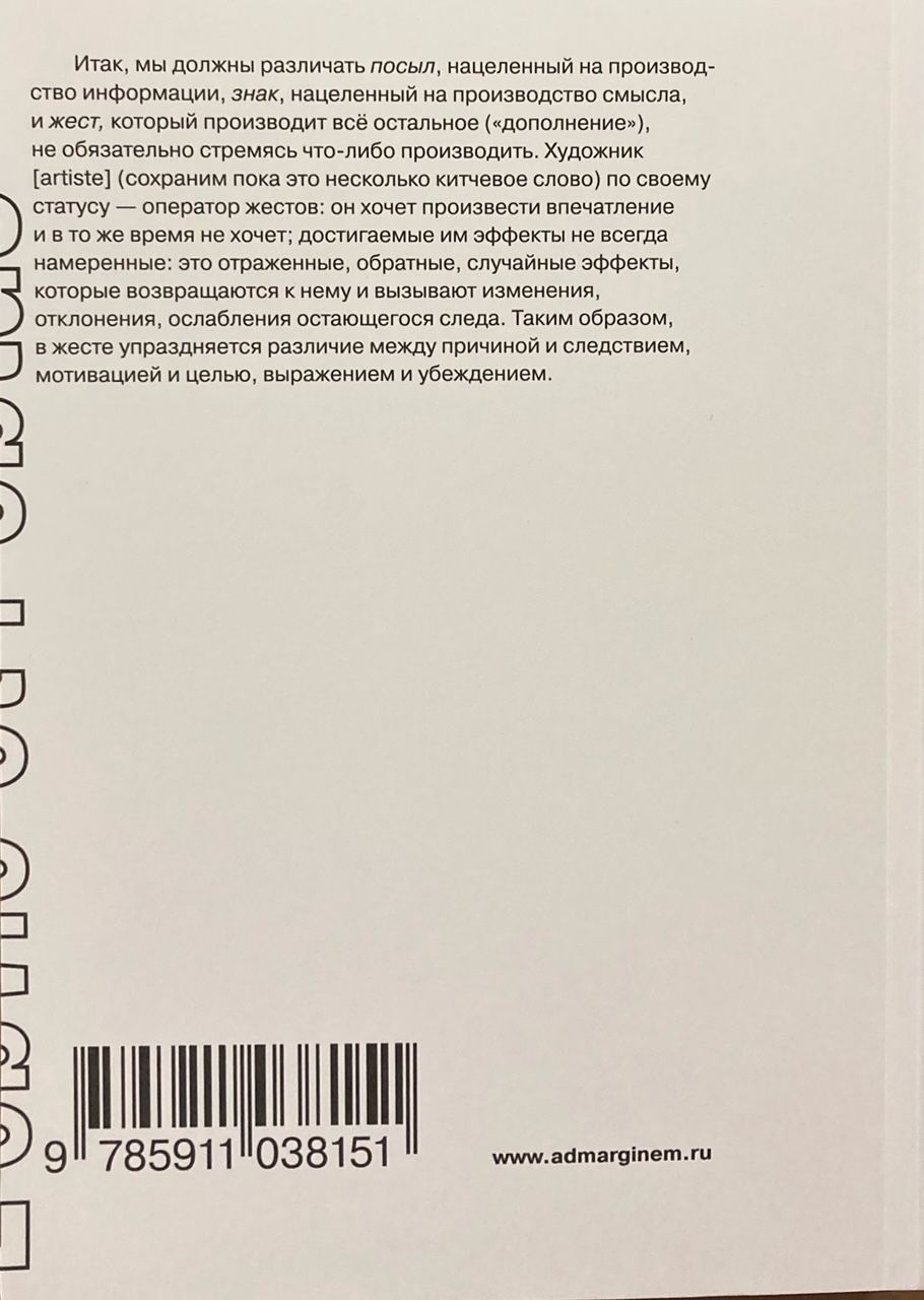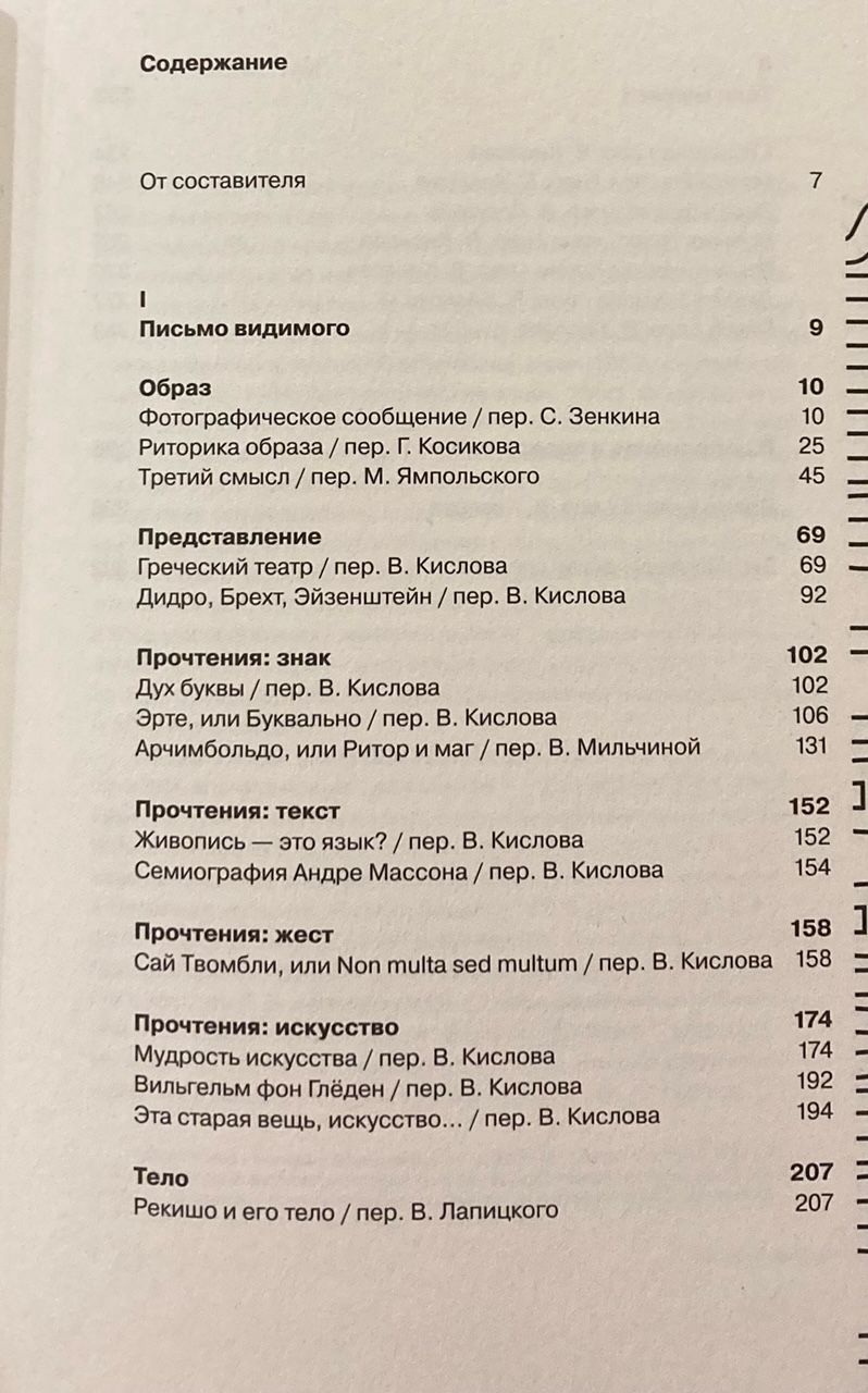 Наследие выдающегося французского философа, литературоведа и семиолога Ролана Барта (1915–1980) включает в себя книги, комбинирующие в разных пропорциях литературное и академическое письмо, заметки к лекционным курсам и их стенограммы, доклады на конференциях и симпозиумах, интервью и многочисленные эссе — статьи для прессы, сборников и энциклопедий, каталогов выставок и т. д. В настоящее издание вошли очерки разных лет, посвященные знаку, значению, письму — темам, определявшим оптику, в которой Барт видел всё многообразие мира, — какими они существуют вне поля литературы. Среди них программные работы о кино и фотографии («Фотографическое сообщение», «Третий смысл»), почти все тексты Барта о художниках (Арчимбольдо, Глёдене, Массоне, Твомбли, Эрте, Рекишо), статьи о музыке и театре. Изобилуя примерами хирургически точного структуралистского анализа в применении к самым причудливым художественным формам, сборник вместе с тем позволяет судить о широте и тонкости эстетических вкусов автора. Большинство работ публикуются по-русски впервые.