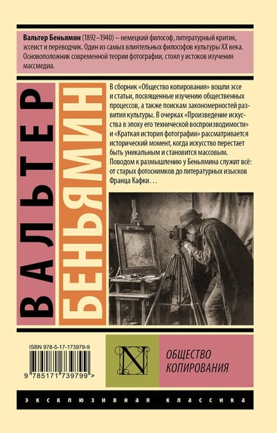 В сборник «Общество копирования» вошли эссе и статьи, посвященные изучению общественных процессов, а также поискам закономерностей развития культуры. В очерках «Произведение искусства в эпоху его технической воспроизводимости» и «Краткая история фотографии» рассматривается исторический момент, когда искусство перестает быть уникальным и становится массовым. Поводом к размышлению у Беньямина служит всё: от старых фотоснимков до литературных изысков Франца Кафки…