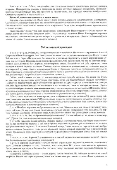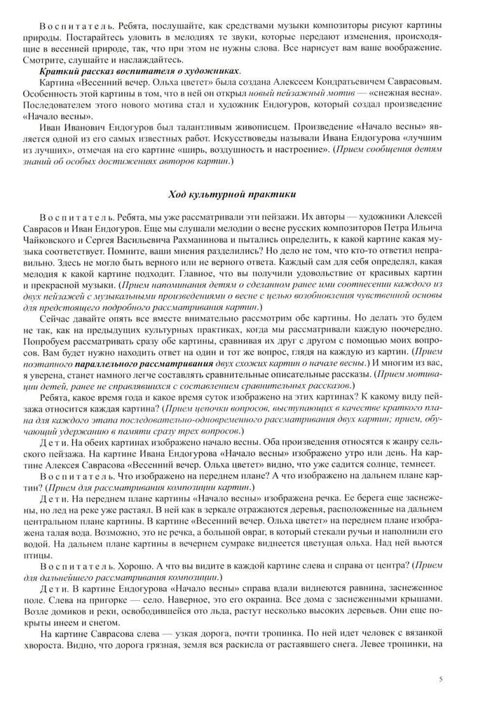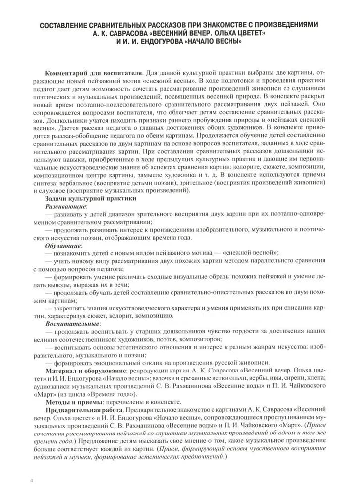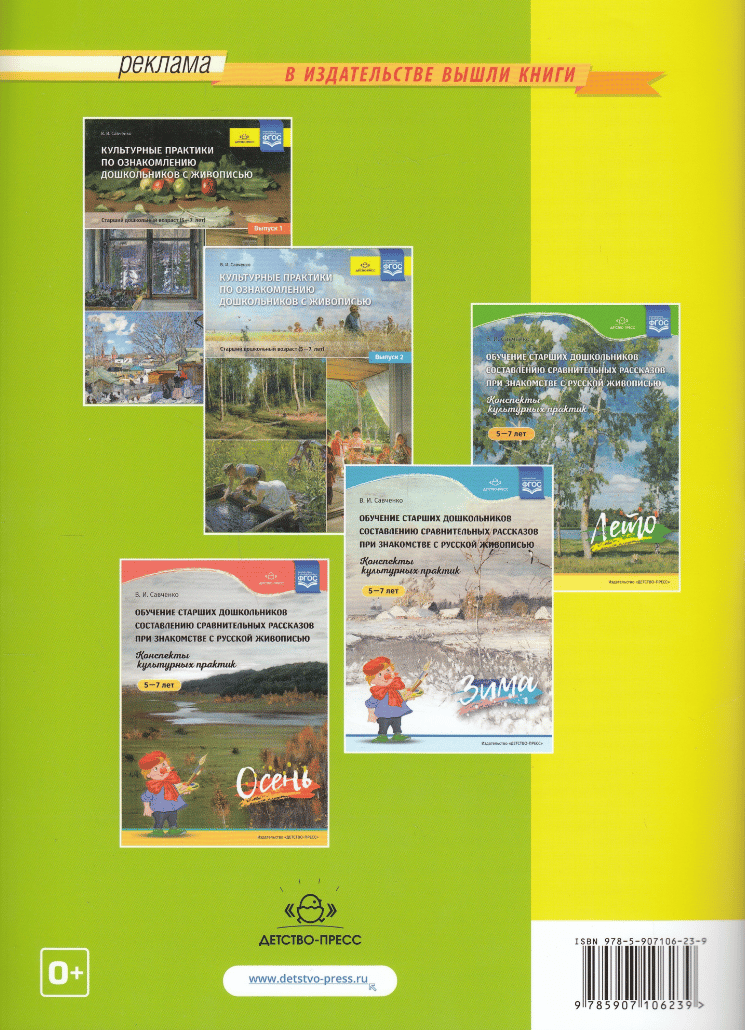 В пособии представлены конспекты культурных практик, которые решают задачи воспитательного, образовательного и развивающего характера, способствуют речевому, познавательному, эстетическому и социально-коммуникативному развитию детей, что соответствует содержательным аспектам образовательных областей ФГОС ДО. В конспектах раскрыты следующие методы и приемы: последовательное и параллельное сравнение детьми двух картин; образец сравнительного рассказа воспитателя. Автором разработаны занятия по знакомству с живописными полотнами из собрания Государственного Русского музея, посвященные четырем временам года. Пособие адресовано воспитателям ДОО, педагогам дополнительного образования, родителям.