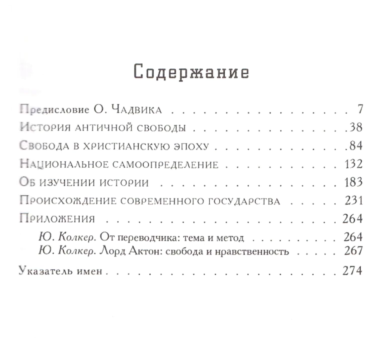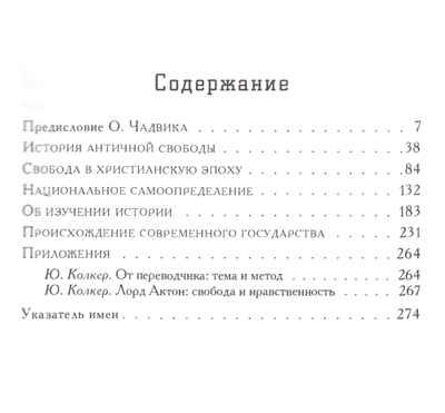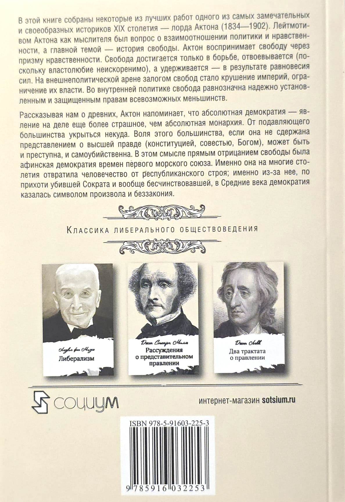 В этой книге собраны некоторые из лучших работ одного из самых замечательных и своеобразных историков XIX столетия — лорда Актона (1834—1902). Лейтмотивом Актона как мыслителя был вопрос о взаимоотношении политики и нравственности, а главной темой — история свободы. Актон воспринимает свободу через призму нравственности. Свобода достигается только в борьбе, отвоевывается (поскольку властолюбие неискоренимо), а удерживается — в результате равновесия сил. На внешнеполитической арене залогом свобод стало крушение империй, ограничение их власти. Во внутренней политике свобода равнозначна надежно установленным и защищенным правам всевозможных меньшинств.