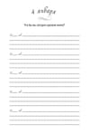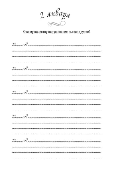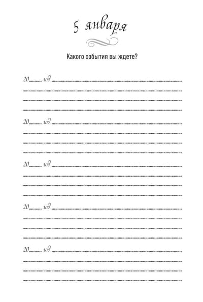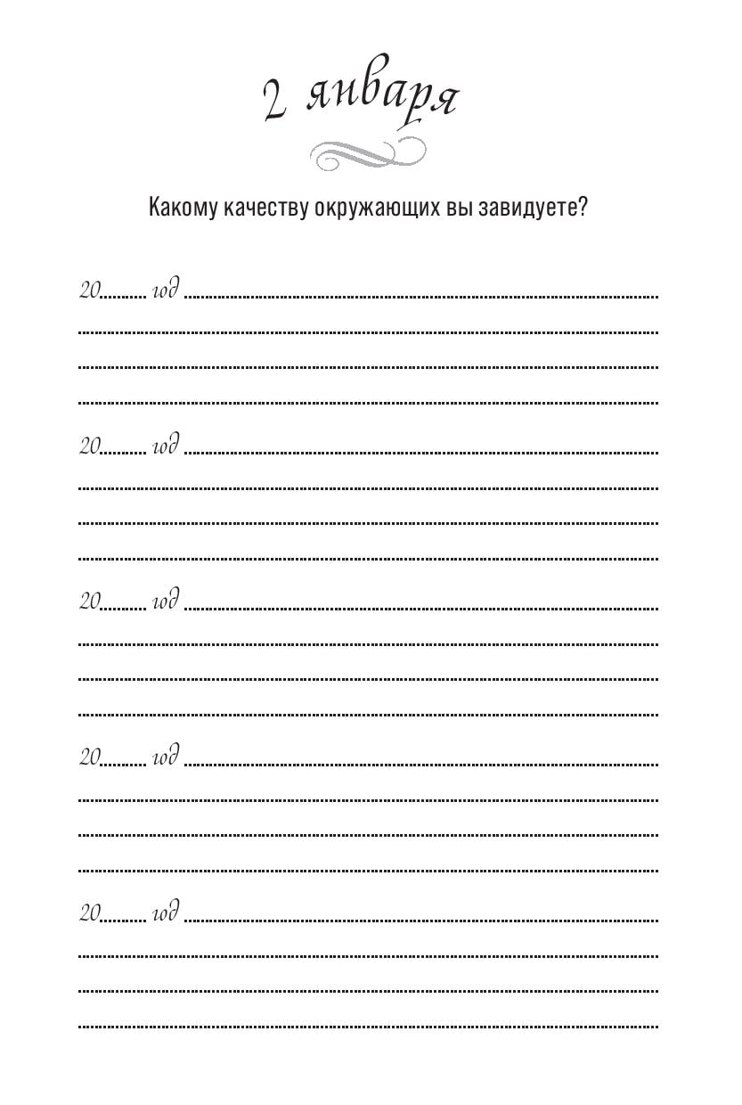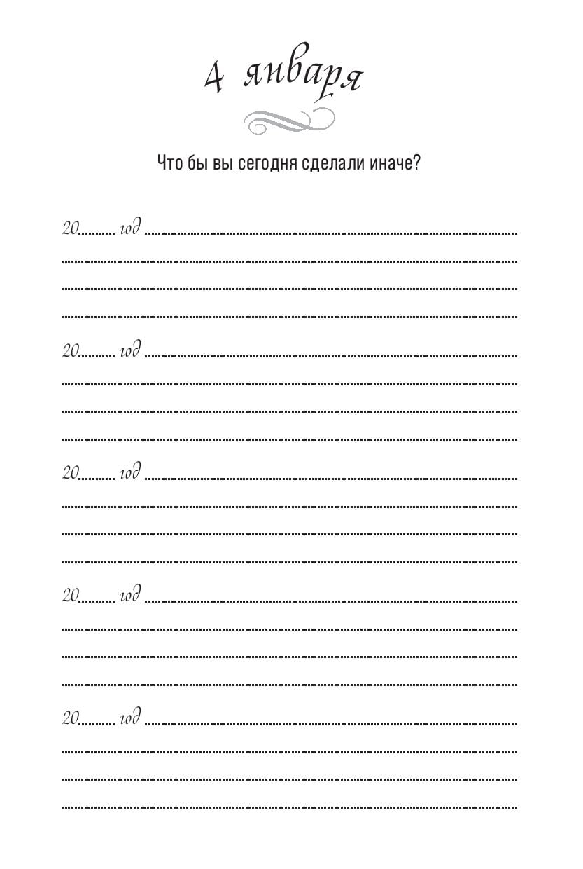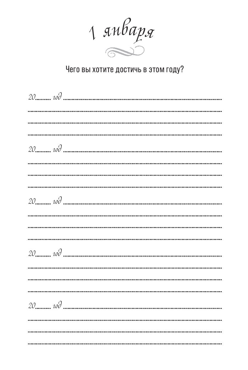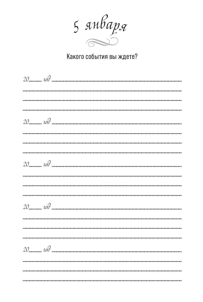 На каждой странице этого пятибука вы найдете вопрос, отвечая на который каждый год в один и тот же день, вы сможете проанализировать изменения своего состояния и мыслей. Здесь собраны разные вопросы — от прозаических до тех, которые касаются смысла жизни. Ежедневник поможет расслабиться после напряженного дня, отдохнуть, привести мысли в порядок, а также повысить осознанность, научиться фиксировать мысли и эмоции.